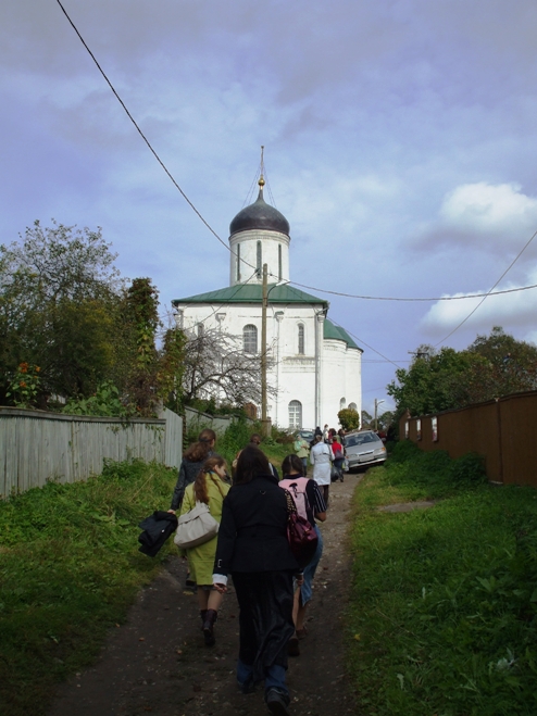 In Svenigorod angekommen, sind wir zunächst zum Krankenhaus gefahren, wo wir dann eine Freundin der Gruppe besucht haben. Das war eine gute Gelegenheit, einen Spaziergang über das Krankenhausgelände zu machen, das aus einem recht großzügig angelegtem Wald besteht. Es gibt dort sogar eine kleine Quelle mit Trinkwasser, das sogar sehr gut schmeckt. Anschließend sind wir am Fluss Moskau auf schmalen und manchmal sehr rutschigen Pfaden entlang gewandert. Im Ort gab es dann zuerst in einem kleinen Supermarkt ein kleines Eis, bevor wir dann weiter zur kleinen Kirche marschiert sind. Dort erwartete uns schon fröhlicher Glockenklang, den einige Kinder im Glockenturm machten. In der Kirche war auch der Priester, der aus der Stadt kam, aus der eines der Mädchen kam, die mitgefahren ist. Er ist auf uns aufmerksam geworden, weil wir ein kurzes Gebet in der Kirche gesungen haben. Ich hätte so gerne mitgesungen, aber Text und Melodie sind mir (noch) unbekannt. Die Kirche selbst ist schon sehr alt, sie wurde zwischen 1396 und 1399 errichtet. In ihr sind noch viele alte (oder nicht restaurierte) Kunstwerke der Ikonenmalerei an den Wänden zu finden, so dass die Kirche ihren ganz eigenen Charme hat und ihr Alter durchaus würdig ausstrahlt.