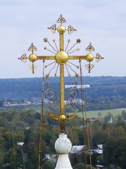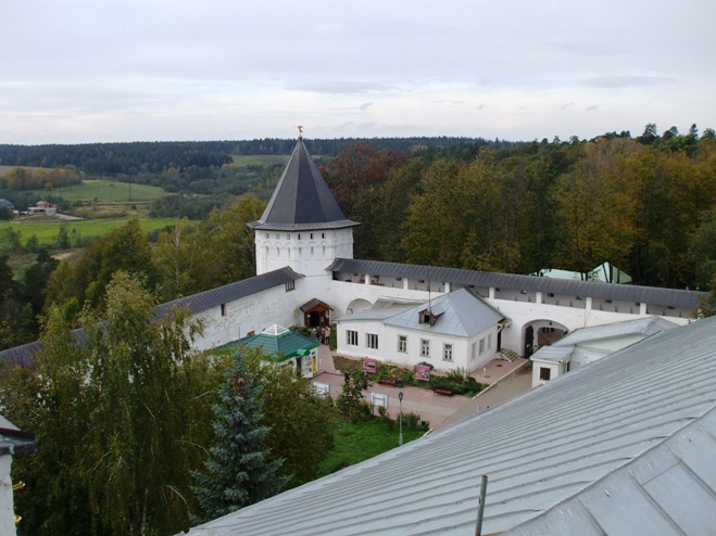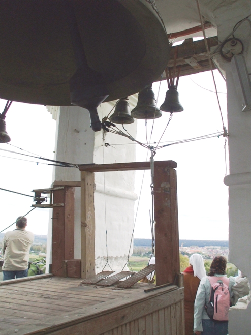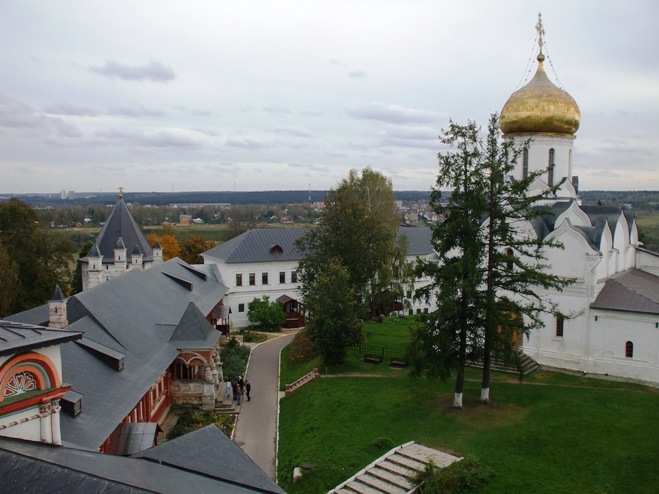 Anschließend sind wir zum Hl.-Ssawwo-von-Sgoroschewskij-Kloster (Савво-сгорожевский-монастырь) gelaufen, dass nicht weit von der Kirche entfernt liegt. Dort war wieder eine Bekannte der Gruppe, die uns dann eine Exkursion angeboten hat in die Winkel des Klosters, wo Besucher normalerweise nicht hinkommen. Der erste Teil ging auf den Glockenturm, von dem man eine wunderschöne Aussicht auf die "Moskauer Schweiz" hat, wie man diese Gegend hier nennt. Dort oben sind einerseits eine, wie ich finde, sehr große Glocke und ein Glockenspiel. Dabei ist es hier so, dass die Glocken nicht schwingen, sondern nur der Klöppel in der Glocke beweglich ist. Die meisten Glockenspiele werden von Hand betrieben, dass heißt, dass es mehrere Pedale mit Seilzügen gibt, die den Klöppel in Bewegung setzen, aber auch Seilzüge, die von Hand betrieben werden. Die Führung ging dann über die Klostermauer, von der man ebenfalls eine wunderschöne Sicht über die Landschaft und Klosteranlage hat. Nach der Führung sind wir dann in die Klosterkirche St. Tatjana gegangen, in der der Heilige seine letzte Ruhestätte gefunden hat dort verehrt wird. Auch hier wurden wieder ein paar Gebete gesungen und der Heilige verehrt.