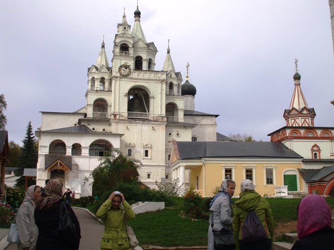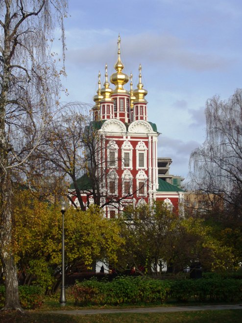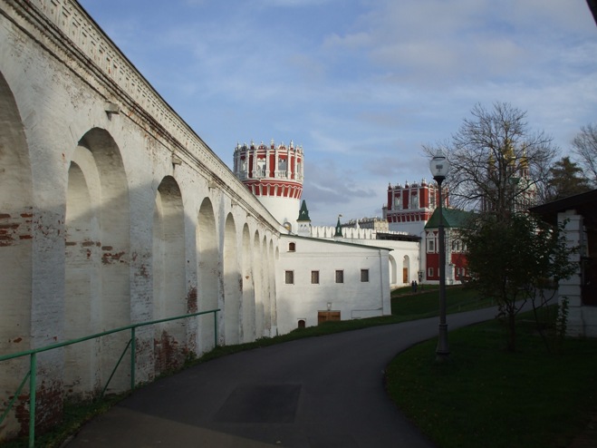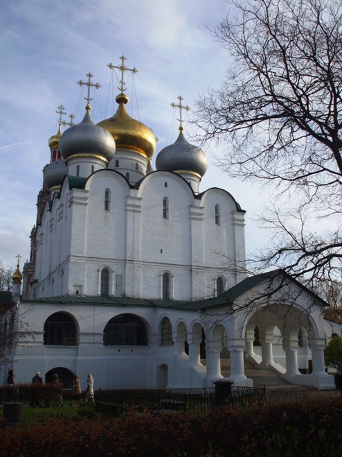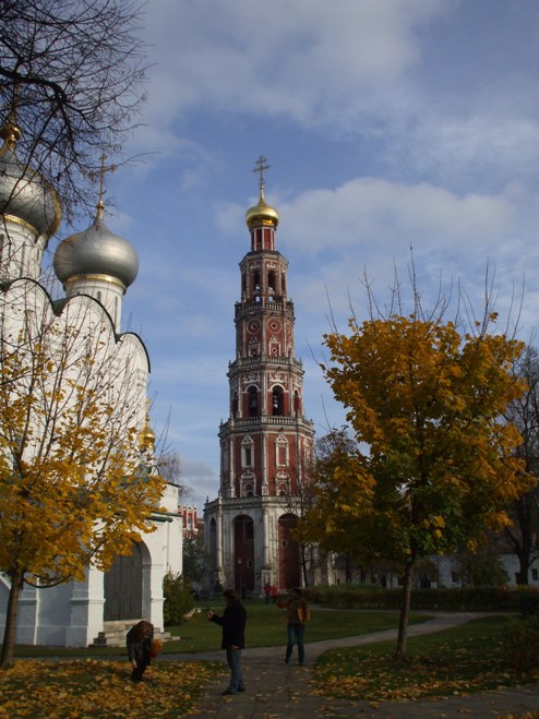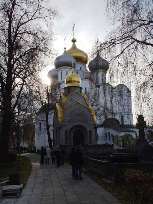 In der letzten Nacht hat es zum ersten Mal etwas gefroren und dementsprechend kalt war es auch. Der Frost kam passend zur Zeitumstellung - jetzt wird es langsam Winter. Im Gegensatz zu Ostfriesland war hier aber heute allerschönstes, wenn auch kaltes Wetter, so dass ich heute eine Winterjacke hätte anziehen sollen. Nach der Göttlichen Liturgie in der Fakultätskirche habe ich mich mit Elena getroffen und wir sind zunächst ins Novodevicny-Frauenkloster in der Moskau gefahren, dass im 16. und 17. Jahrhundert erbaut worden ist. Es ist auch ein sehr schönes Kloster mit einem Friedhof, auf dem bekannte Persönlichkeiten ihre letzte Ruhe gefunden haben - gesehen habe ich aber nur den alten. Auf dem neuen soll der ehemalige Präsident Boris Jelzin beerdigt worden sein. In dem Kloster hatte man das Gefühl, dass Elena die einzige Russin war - es war förmlich überlagert von Touristen. Von der Schönheit steht das Kloster dem in Sergijew Possad fast nichts nach. Wobei es vor nicht allzu langer Zeit aufwendig renoviert worden ist und immer noch wird.