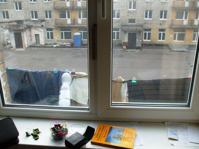 Heute war Waschtag! Der gestrige Tag hat doch seine Spuren an Kleidern und Schuhen hinterlassen, da die Wege nicht sehr sauber, dafür umso mehr rutschig waren. Durch das Feuer rochen die Klamotten zudem nach Qualm und an diesem Morgen das ganze Zimmer. Da das Wetter wieder gut war, habe ich die sauberen Sachen noch vor der Uni ins Fenster und nach draußen vor das Fenster gehängt, so dass sie nachmittags überwiegend trocken waren. Dabei musste ich ein wenig improvisieren: Die Gardinenleiste dient als Wäscheleine und draußen am Fenster habe ich an beiden Seiten zwei starke Haken, an denen ich - wie schon an anderer Stelle erläutert - drei Rödelriemen zusammengesteckt habe. An dem einen Ende der "Kette" ist eine Schlaufe, auf der anderen Seite muss ich mit Draht, mit dem ein schweres Kabel festgebunden ist, das andere Ende der "Kette" verknoten. Als Wäscheklammern dienen Bügelclips, mit denen man normalerweise Aktenmappen zusammenhält. Diese habe ich in einem Bücherladen mit Papeterie-Sortiment gekauft. Eine 1,5l-Flasche habe ich mit etwas Kabelbinder, das ich an einem gekauften Messer gefunden habe, und einer Büroklammer an den Riemen befestigt, so dass ich jetzt die Leine etwas auf Abstand zur Fensterbank und Hauswand halten kann. Die Russen können gut improvisieren - aber mithalten kann ich allemal!