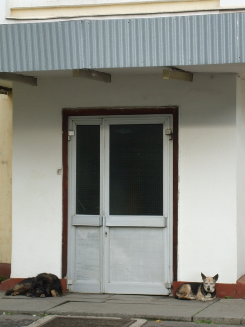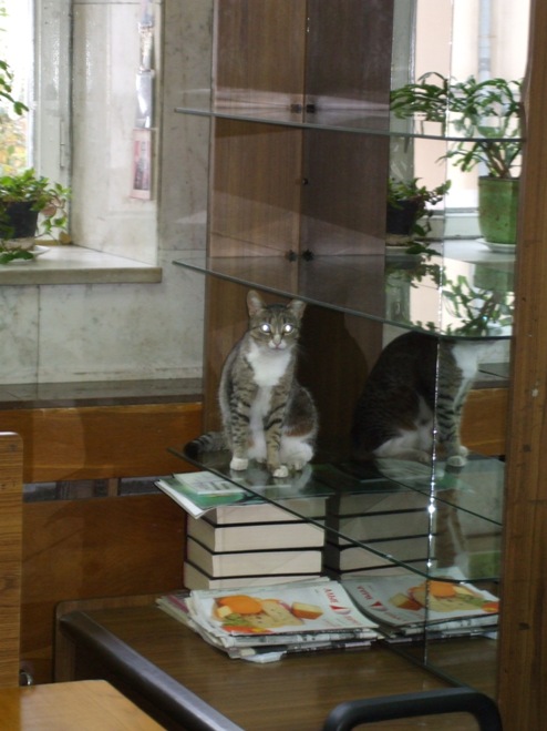 Im Hauptgebäude in der Haupthalle trifft man manchmal auf die Fakultätskatze die über die Bücherauslage unseres Buchverkäufers läuft, von dem ich den Eindruck habe, dass er schon mehr Bücher gelesen als verkauft hat, auf der Fensterbank oder dem Glasregal sitzt. Und vor der Eingangstüre dösen oft die beiden Wachhunde in der Sonne. Und manchmal sind auch ihre Freunde von nebenan zu Besuch, so dass hier dann drei oder vier Hunde friedlich schlafen. Alles in allem klingt das für deutsche Verhältnisse etwas ungewöhnlich, aber für mich hat diese Universität eine besondere Atmosphäre, die verlorengehen würde, wenn alles gerade, aufgeräumt und perfekt wäre - wie gerade schon gesagt. Um es kurz zu sagen – mir gefällt es hier sehr gut. Eigentlich ist die Uni sogar der Platz in Moskau, der mir am besten gefällt: Hier ist eine andere Welt: Kein Stress, keine Hektik, alle sind freundlich und grüßen einander, in irgendeinem Zimmer klimpert immer ein Klavier, viele lassen sich von einem der vielen Priester segnen - ganz unbefangen und ohne den Hintergedanken an eine gute Zensur oder um einen guten Eindruck zu machen.