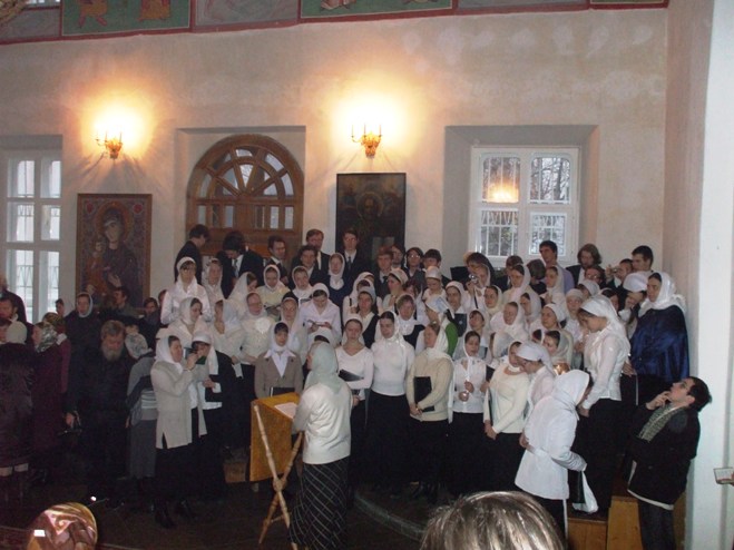 "Wenn wir mit unserer Matuschka singen, gibt es ueberhaupt keine Schoenheit, weil dieFrauen alt sind und ihre Stimmen klingen gar nicht schoen, aber da hoerst du den wirklichen Glaube, den sie so viel Jahre haben, die sie so oft schuetzen gezwungen waren, der Gottesdienst ist da wircklich stark und du vergisst schon ueber die Schoenheit und siehst die Schoenheit von ihren Seelen und Schoenheit des Gottesdienstes und verstehst ganz sicher und zweifelst nicht mehr, dass genau so alles sein muss. Ich hoffe ganz stark und bete, damit du es fuehlen wirst, weil beschreiben kann man so was nicht. Stell dich vor, unsere Matuschka lebte in der Sowjetzeit und war GLAEUBIG! Sie wollten die Lehrer aus der Schule wegschmeissen, aber sie blieb glaeubig, sie wohnte im unbeschreiblichen Armut und blieb glaeubig, sie konnte nicht studieren und blieb glaeubig, sie musste arbeiten fuer die ganze Familie in der Nacht und am Tag, weil die Priester wurden nich bezahlt und blieb glaeubig, jetzt wohnt sie im Haus, wo uebels kalt ist aber du hast die Kirche gesehen... Jetzt stell dich vor, welche Seele sie hat... Ich habe ein Glueck, dass ich mit so einer Frau zusammen singen kann und fuer mich ist wircklich grosse Ehre, dass ich unseren Priester kenne und von ihm getauft bin...