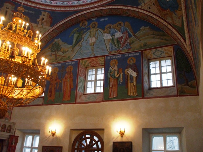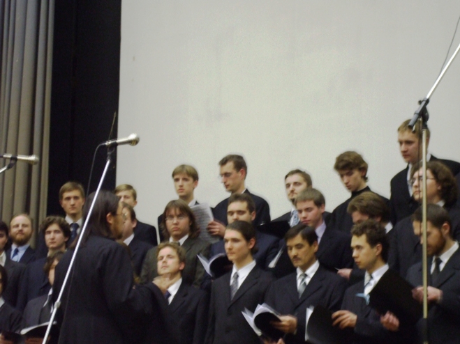 In der MGU haben wir nicht nur das Singen ein wenig geprobt, sondern auch den optimalen Abgang von der Bühne, damit dies vernünftig aussieht. Auch die anderen Chöre haben noch einmal ihre Lieder gesungen, bevor es dann für uns ernst wurde. Das war kein Konzert im klassischen Sinne, sondern eine Präsentation der einzelnen Fakultäten der PGSTU (Orthodox-humanistische St. Tichon Fakultät). Dabei zeigte sich, dass die Universität weitaus größer ist, als ich vermutet hätte. Neben der theologischen Fakultät gibt es die Möglichkeit an den einzelnen Fakultäten Informatik, Sprachen, Geschichte, (Kirchen-)Musik und noch vieles mehr zu studieren. Sehr interessant finde ich die Missionsfakultät, die tatsächlich hin und wieder Ausflüge nach Sibirien oder in Kasernen oder andere Einrichtungen machen und dort die Menschen unterrichten mit dem Ziel der Taufe. Aber auch die Arbeit an alten, verfallenen Kirchen gehört dazu. Aber auch die Fakultät der Ikonenmalerei, die ich ja an einer meiner ersten Tage hier schon erwähnt habe, übt ihren besonderen Reiz aus, ebenso wie die Fakultät, die Kirchen im Innern mit Ikonen bemalt - also an Decken und Wänden. So hat diese Fakultät beispielsweise die Decken- und Wandgemälde in der Dreifaltigkeitskirche gemacht, die oben auf den Fotos zu sehen sind. Und zwischen den einzelnen Vorstellungen in Bild und Ton sang dann ein Chor. Wir waren die ersten, die singen mussten. Vor dem Auftritt hat sich allerdings gezeigt, dass wir auch die Aufstellung im Gang des Saales hätten üben sollen, denn dort herrschte absolutes Chaos. Zunächst haben wir den Wechselgesang "Sokrovennoje Tainstvo" (Geheimnisvolles Sakrament) gesungen - Download hier - und dann "Vsbrannoj Voevodij" (vage Übersetzung: "Kämpfender Heerführer". Damit ist die Gottesmutter Maria gemeint, die uns im Kampf zur Seite stehen soll) Download hier. Wenn wir so schlecht gesungen haben, wie sich die Aufnahmen anhören, dann waren wir nicht sonderlich gut. Zum Abschluss haben wir noch "Auf viele Jahre" gesungen, dass ich auch als Geburtstagslied kenne - wir haben es aber als Gebet gesungen. Da wir alle auf der Bühne stehen sollten, bin ich mitgegangen, obwohl ich die Noten nicht konnte. So habe ich nur lautlos mitgesungen.