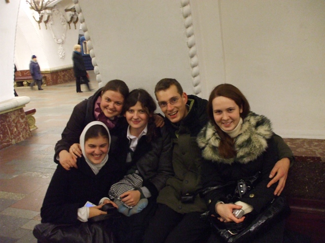 Der Nachhauseweg wurde dann sehr lustig und spaßig! Bei der Garderobe sprach mich Mascha an, die gerne mit mir ins Wohnheim fahren wollte. Sie kannte ich schon, da ich hin und wieder gemeinsam mit ihr nach Hause fahre. So war ich dann zunächst mit ihr, einer weiteren Masha, Shenia und Katja unterwegs. In der U-Bahn gesellte sich dann Pjotr dazu und später in der Elektritschka noch ein weiterer Student. Zumindest waren wir sehr fröhlich, haben viel gelacht und viel herumgealbert. In der Station Kurskaja mussten wir uns dann schon von Shenia verabschieden, da sie nicht im Wohnheim wohnt. Aber auch wir sechs hatten gemeinsam unseren Spaß. In einer Metro-Station haben wir dann gemeinsame Fotos gemacht. Leider wussten wir alle nicht, dass die Wand hinter der Bank dick mit Kalkfarbe bestrichen war - nicht frisch - aber es reichte dennoch, dass wir uns stark abklopfen mussten, da überall auf den Jacken und Rucksäcken weiße Flecken waren.