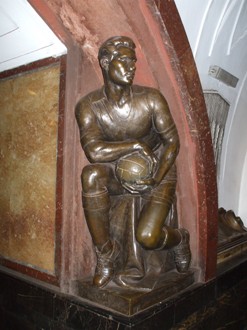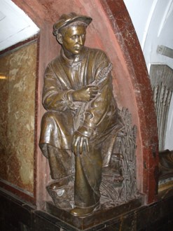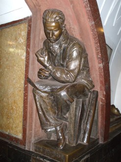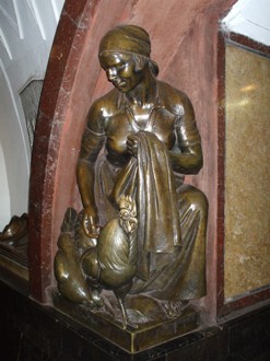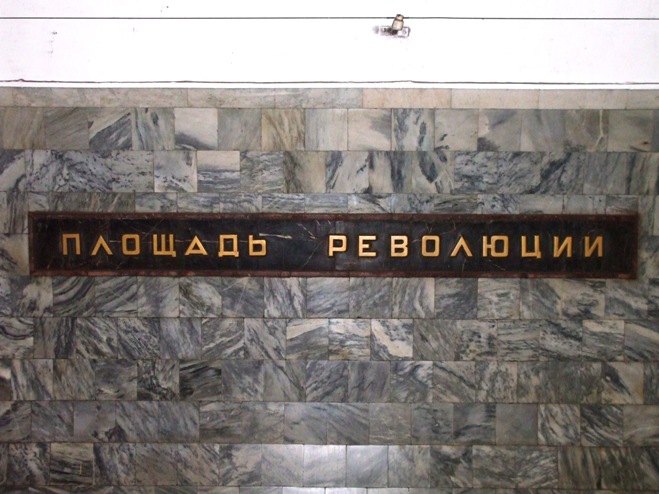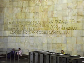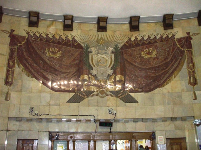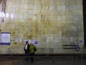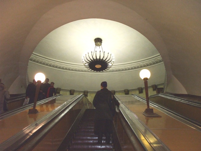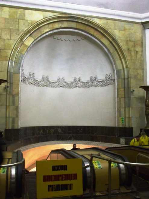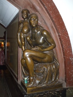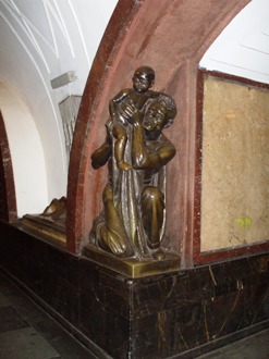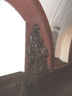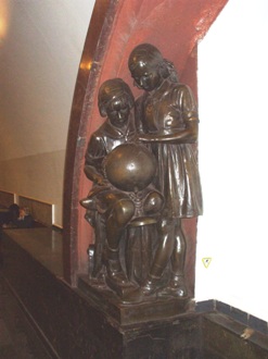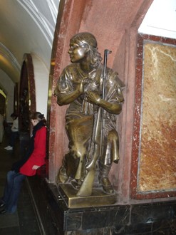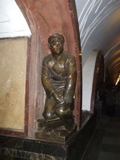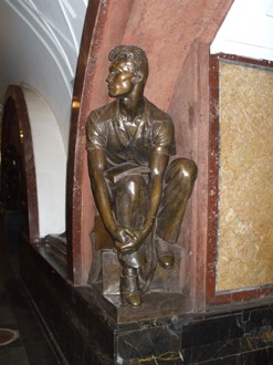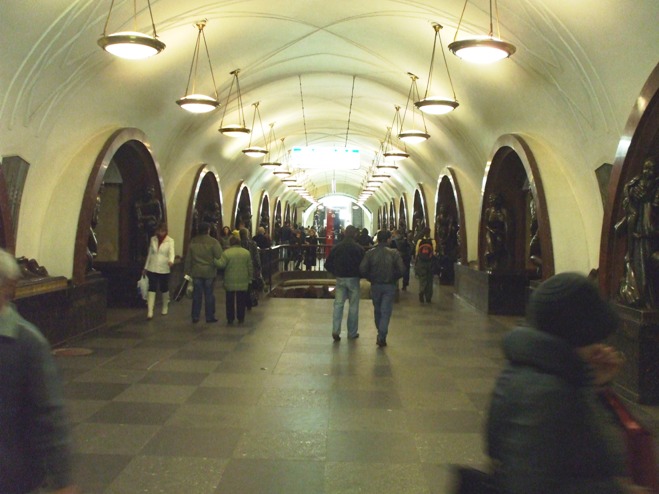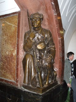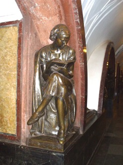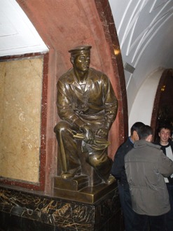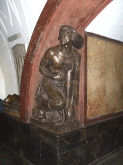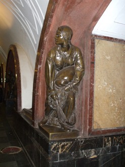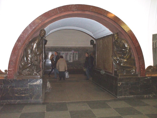 In den letzten Wochen komme steige ich immer häufiger in einer der schönsten Metro-Stationen Moskaus um - zudem ist es noch die älteste. Wenn ich die Station betrete, dann herrscht dort ein dunkles und beruhigendes gelbliches Licht, dass von den Lampen, die in der Halle von der Decke hängen, ausgeht. Alles ist in grauem oder rotbraunem Marmor gehalten. Zu meiner rechten befinden sich die Gleise der U-Bahn und zu meiner linken tun sich die Durchgänge in die Haupt- oder Mittelhalle auf, die als marmorne Rundbögen gebaut sind. An den vier Ecken dieser Rundbögen sind jeweils Skulpturen angebracht - allesamt aus mittlerweile aus glanzlos gewordenem Messing - dennoch strahlen sie ihren Charme aus. Sie alle zeigen Berufe oder zeigen den Stolz der ehemaligen Sowjetunion und mit Sicherheit auch deren vergangene Stärke: den Gleisarbeiter, Fallschirmspringer, Flughafenlotsen, Polizist mit Wachhund, das Mädchen mit Gewehr, den Bergmann, Ingenieur, den Bauern und die Bäuerin, den Studenten und die Studentin, den Sportler, Vater mit Kind, die zwei Schüler mit einem Globus in der Hand und zwei Jungs mit einem Spielflugzeug unterm Arm und die Frau mit Kind. Viele diese Figuren haben einige blanke und goldene Stellen, weil die Menschen sie im Vorbeigehen kurz berühren oder anfassen. Sie gelten als Glücksbringer. Insbesondere der Hund des Polizisten hat eine goldene Schnauze. Fährt man mit der Rolltreppe hinauf zum Ausgang, dann sieht man zunächst den großen Kronleuchter, der in der Kuppelhalle hängt und dann fällt der Blick auf ein großes Bild, das auf die Marmorwand gemalt wurde - es zeigt rotes Tuch und in der Mitte Hammer und Sichel mitsamt Kommunistenstern zur Ehre des 30jährigen Bestehens der Sowjetunion. Rechts befindet sich die Nationalhymne der Sowjetunion. Es muss demjenigen, dem das sozialistische System oder die Sowjetunion naheliegt, wie eine Art Fahrt in den sozialistischen Himmel vorkommen - auf der Rolltreppe der roten Fahne und Hammer und Sichel entgegen... Betrachtet man diese Bauwerke genauer, kann man in der Tat eine Anlehnung der Bauten an eine Religion finden. Diese Bauten haben gewisse Elemente, die einem Gotteshaus durchaus ähnlich sind: Kuppelhallen, Lenin, viele Verzierungen, Bilder sozialistischer Taten, usw. Und es lässt sich in diesem Fall vielleicht sogar eine gewisse Symbolik deuten: Aus dem Dunkel, der Unterwelt hinauf in den kommunistischen Himmel.