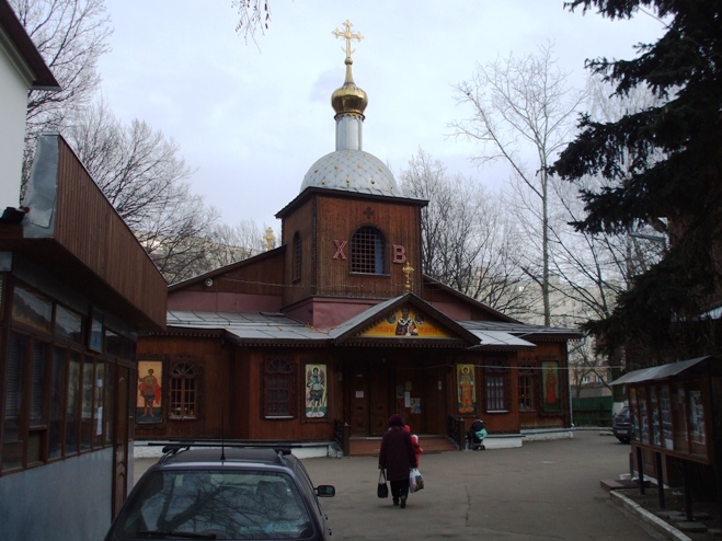 Als der Wecker um acht Uhr klingelte, habe ich nicht den Dreh bekommen aufzustehen und bin noch gute vierzig Minuten länger im warmen Bett liegen geblieben. Dementsprechend bin ich auch viel zu spät zur Göttlichen Liturgie angekommen - ich war erst zum Glaubensbekenntnis da. Um zwölf Uhr war ich in der Metro-Station mit Elena verabredet, die sich aber verspätet hatte. Dadurch ist es zu einer interessanten Begegnung bekommen: Auf mich kamen zwei Mädchen zu und eine fragte mich: "Wartest Du auf ein Mädchen?" Ich war in dem Moment so verdattert und sagte nur "Ja." und hatte damit auch schon einen Rosenstrauß in der Hand. "Sie wird sich sehr freuen", sagten die beiden und verschwanden ebenso schnell, wie ich wieder gekommen war. Da stand ich dann nun mit den Blumen in der Hand. Lena und ich haben dann beschlossen, sie bei den Märtyrern an der Gedenkstätte Butovo (Butawa) abzulegen, wo wir ja heute hinfahren wollten. Zu meiner Überraschung meinte sie, dass man dort auch vom Paveljetzker Bahnhof hinfahren könnte, nur eine andere Station wählen müsse. Meine Skepsis wurde nach der Ankunft dort voll bestätigt, von Birjuljevo aus kann man nämlich nicht Butovo erreichen. Dafür haben wir eine umso schönere orthodoxe Holzkirche gefunden, die von innen zwar alt, aber in ihrer Eigenart schön aussah und die mir sehr gefallen hat. Sie war eigentlich eingerahmt von Hochhäusern. Ringsum der Kirche war jedoch noch ein dichter Birkenwald, so dass dieser im Sommer wie eine kleine grüne Oase wirken muss. Auf dem Rückweg habe ich mir auf dem Markt beim Bahnhof noch warme Handschuhe gekauft, da ich sie heute das erste Mal wirklich benötigt habe - vor allem mit den Rosen in der Hand.