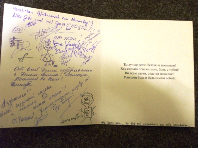 Diese Karte trifft den Nagel an für sich auf den voll Kopf, da sie gut das Verhältnis zu meiner Kommilitonen zu mir zeigt. Viele Dinge finden sich auf der Karte wieder, die ich in diesen ersten Monaten hier erleben durfte: Da ist zum einen der "Superstar". Es ist zwar ganz schön, wenn man bekannt ist, viele Hände schüttelt, mich fast jeder grüßt und jeder gerne mit mir sprechen möchte. Es ist aber auch umso schwerer, Zeit für mich zu finden, so dass ich mich mal zurückziehen kann. Meistens klopft dann doch wieder irgendwer an meiner Türe und ich mag dann auch nicht gerne nein sagen. Und bei der orthodoxen Damenwelt scheine ich auch ziemlich beliebt zu sein, da ich mehr Kontakte zu Studentinnen oder Lehrerinnen pflege als eigentlich alle anderen Jungs hier. Dementsprechend gehen jetzt schon seit ein paar Wochen Heiratsgerüchte um, die ich zunächst zwar auf die leichte Schulter genommen habe, seitdem mich aber Vater Nicolai darauf angesprochen hat, bin ich mir noch nicht sicher, ob diese Gerüchte nicht zu weit ins Dekanat vorgedrungen sind. Olga hat mir aber zu meiner Beruhigung gesagt, dass dort darüber gelacht wird. Würde es hier eine studentische Klatschzeitung geben, dann würde ich sicherlich ziemlich oft auf der Titelseite stehen. Zum Glück erhalte ich noch keine Liebesbriefe, Teddybären usw. Auf der Karte findet sich aber auch mein berühmt gewordener Spruch, der nach wie vor an meiner Türe hängt und grammatikalisch unkorrekt bleibt: Mnoga Stress (Viel Stress). Dieser resultiert ja aus den Sprachschwierigkeiten, wo sich einige Studenten unterer Kurse im Wohnheim drüber lustig gemacht hatten. Auf der Karte findet sich auch die erste vernünftige Schneeballschlacht wieder, die ich mit einem Haufen Mitbewohnerinnen gemacht habe: "Wir lieben Dich... aber dennoch werden wir Dich mit Schnee überschütten." Und für eine Fortsetzung dieser bin ich natürlich immer zu haben. Es fehlt eigentlich nur noch der Schnee. Und dann haben wir noch die Glückwünsche "Endloser blauer Himmel und eine Hose voller Glück!!! Gute Karte, nicht wahr? Sei ein Kämpfer!" und "Von ganzer Seele Glückwünsche zu Deinem Namenstag! Gottes Hilfe in allem." Und auch dies kann man in Russland und in Moskau in jedem Fall gut gebrauchen! Diese Karte kommt im Wesentlichen vom Chor - wie unschwer zu erkennen ist. Wenn ich mir in Zukunft diese Karte anschaue, dann werden gerade mit ihr viele schöne Erinnerungen verbunden sein. Passend dazu habe ich soeben einen Spruch in meinem Adventskalender gefunden, den ich ja geschenkt bekommen habe: