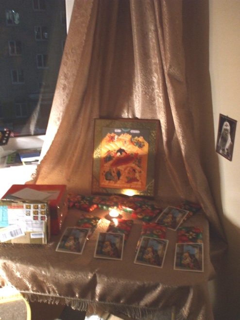 Nach dem Essen in der Stalowaja ging mein Weg nach Hause und alles Geplante ist wieder einmal über den Haufen geworfen worden. Zunächst habe ich die Elektritschka verpasst und musste über 50 Minuten auf die nächste warten und dann sollte ich mit einer Mitarbeiterin der Hausverwaltung zur Post gehen und das Paket abholen. Ich habe es erhalten - es war tatsächlich ein Fehler der Post, die vergessen hatten, meinen Namen auf den Abholschein zu schreiben. Rechtzeitig zum Fest konnte ich aber das Paket meiner Eltern in Händen halten. Gott sei Dank! Zurück im Wohnheim blieb nur noch Zeit, den Gabentisch vorzubereiten und die Lebensmittel für das Abendessen zu sortieren.