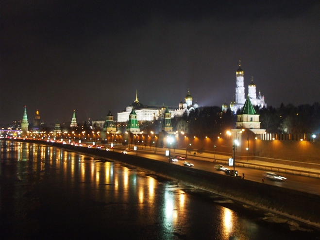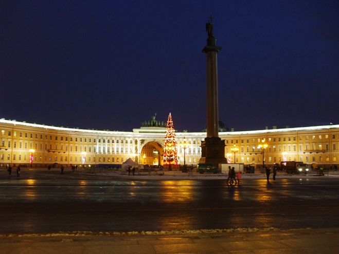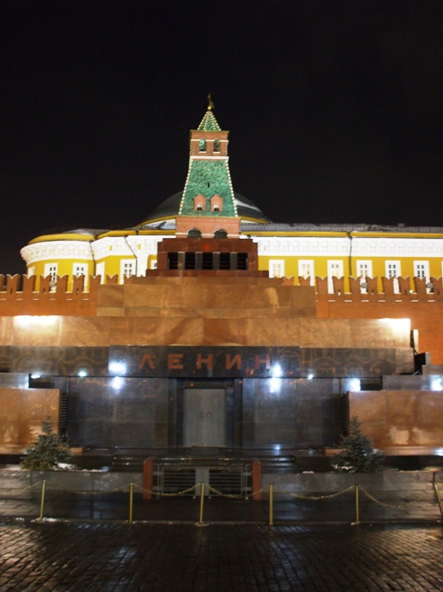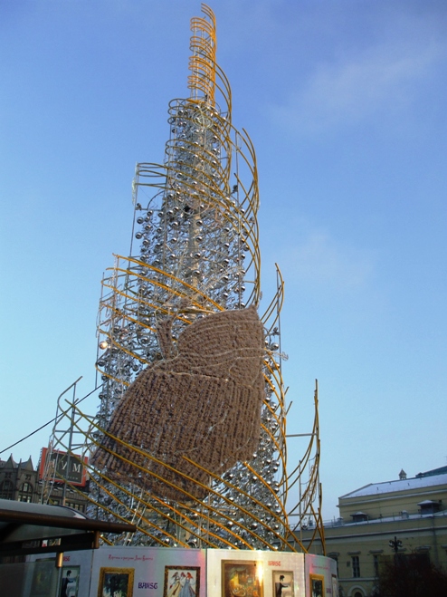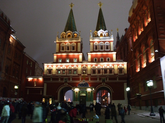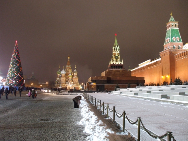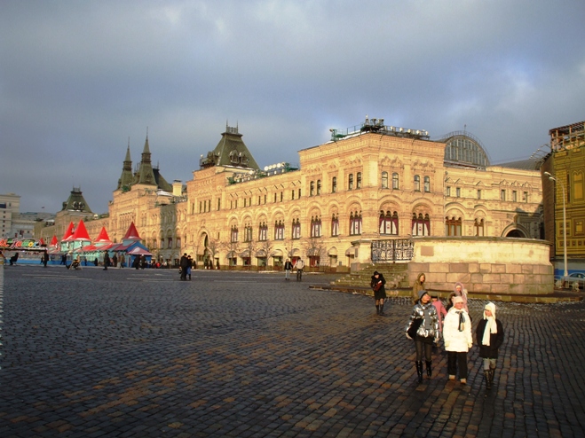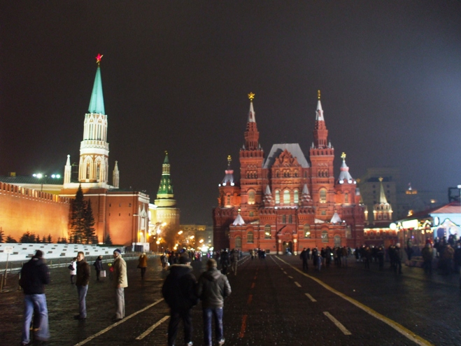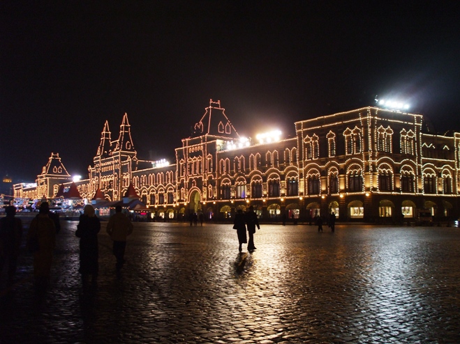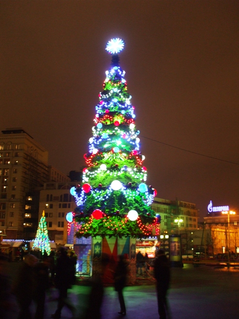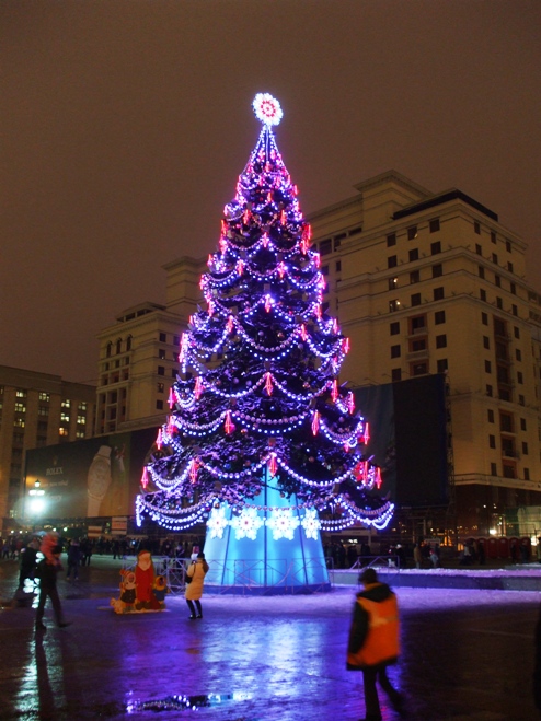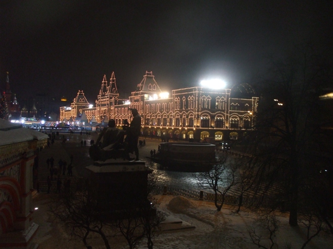Der Weg zum Hotel gestaltete sich als recht kompliziert, da wir voll in den Berufsverkehr gekommen sind und die beiden recht große Koffer dabei hatten. Dennoch hat alles sehr gut geklappt und wir hatten zusammen einen Heidenspaß. Nach dem Einchecken ins Hotel haben ich die beiden zum Roten Platz geführt. Auf dem Weg dorthin habe ich extra eine der schönsten Stationen ausgesucht, wo wir ausgestiegen sind - die Station "Platz der Revolution". Dort kamen wir dann direkt beim Weihnachtsmarkt heraus, den ich am Morgen ausfindig gemacht hatte. Dort stand ein bunter Weihnachtsbaum, der für mich schon typisch geworden ist, der aber in der Tat recht ungewöhnlich, weil er nach unserem Verständnis kitschig ist. Und dann kamen wir auf den Roten Platz, wo alles herrlich beleuchtet war. Auch für mich war es ein besonderes Erlebnis, den Platz mal bei Nacht betrachten zu können. Zum Schluss haben wir dann noch bei meinem Internetplatz ein wenig zu Abend gegessen und eingekauft. Zum Erstaunen der beiden lässt sich in dem Supermarkt fast alles kaufen, was es auch in Deutschland gibt. Vor allem von den Biersorten, die aus Deutschland und Bayern importiert worden sind, waren sie begeistert. Auch ich bin es immer noch, obwohl die Preise ebenso erstaunlich hoch sind.