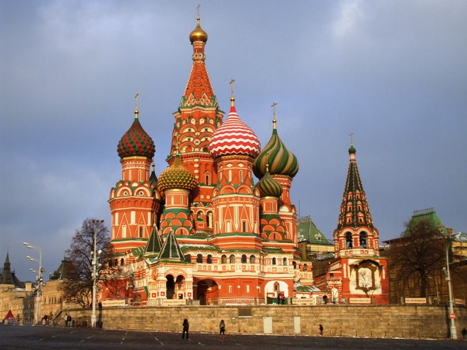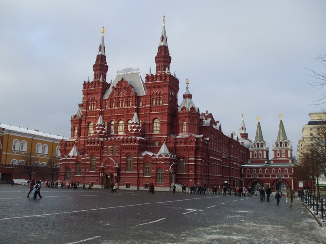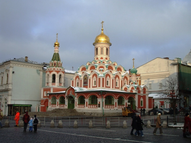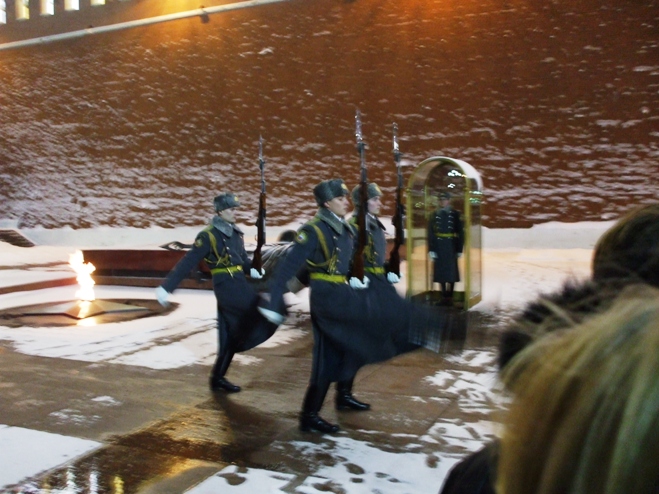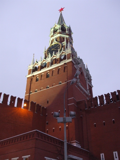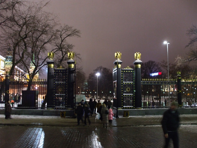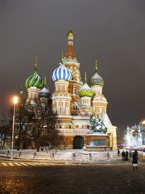 Anschließend sind wir in unsere Stalowaja gefahren, wo wir so einige meiner Freunde getroffen habe - Dmitri hat sich dann zu uns gesetzt und wir haben uns noch etwas mit ihm unterhalten. Nach dem Essen habe ich noch kurz jemanden getroffen und Sonja ist dann schon alleine in die Garderobe gegangen. Dort hat sie Nina getroffen, die ihr dann alles mögliche erzählt hat. Nur hat Sonja, wie ich am Anfang auch, überhaupt nichts verstanden, nur dass sie eine ganz liebe Babuschka vor sich hat. Anschließend wollten wir in die Basiliuskathedrale auf dem Roten Platz gehen, doch kurz nach dem Aufbruch und Wodkakauf der beiden rief Andrej an, der uns dann mit dort begleitet hat. Dort haben wir dann für jeden Studenteneintrittskarten bekommen und haben uns dann die Kirche, die eigentlich neun miteinander verbundene Kapellen darstellt. Sie wurde zwischen 1552 und 1561 erbaut durch Zar Iwan den Schrecklichen, der den Architekten die Augen ausstechen ließ, damit sie nicht noch ein schöneres Bauwerk errichten konnten. Die Kirche wird auch "Steinerne Blume" genannt oder die "Maria-Schutz-und-Fürbitte-Kathedrale". Anschließend sind wir noch in den Alexandrinischen Garten gegangen, haben uns dort um- und eine Wachablösung gesehen. Anschließend waren wir noch schnell einkaufen und sind dann mit der Metro zur Zarenresidenz nach Zarizino gefahren am Rande Moskaus. Dort haben wir das Schloss nur aus der Ferne gesehen und uns einen Blick in den Park genehmigt. Anschließend sind wir müde von den vielen Fußmärschen und der Kälte nach Hause gefahren. Durch den Schnee, der auch in der letzten Nacht gefallen war, war der Park in eine wunderschöne Landschaft getaucht, die sich im Dunkeln nur erahnen ließ. Da ich früh wieder zu Hause war, habe ich nun die Zeit gefunden, wenigstens etwas im Tagebuch zu schreiben. So habe ich heute den Bericht vom heutigen Tag geschrieben und hoffe, dass ich gleich noch wenigstens einen weiteren Tag schaffe. Aber ganz so spät soll es heute nicht mehr werden.