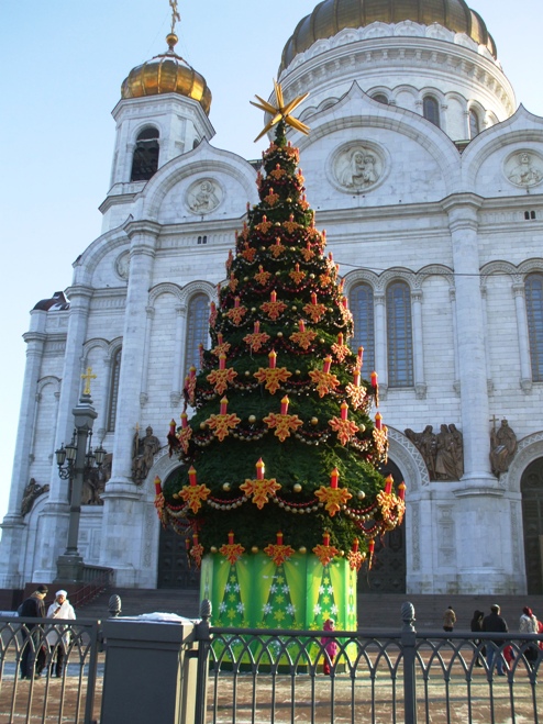 An diesem Morgen fiel mir das Aufstehen sehr leicht, da ich wusste, dass mich heute ein spannender und lustiger Tag erwartet. Es ging am gestrigen Abend ja schon sehr lustig zu und heute sollte sich dies wiederholen. So habe ich die beiden dann im Hotel abgeholt, musste jedoch ein wenig warten, weil sie sich etwas verschlafen hatten. Da Ludwig sich eine Fellmütze kaufen wollte, sind wir zuerst auf den Markt am Jaroslawler Bahnhof gefahren, wo wir jedoch so früh noch nicht viel gefunden haben. So haben wir uns die Station Komßomolskaja angeschaut und sind dann zum Roten Platz aufgebrochen. In den Metros war nicht viel los, da ja Wochenende war, so dass die Stadt heute recht ruhig war. Bevor wir unser Ziel erreicht haben, sind wir erst noch auf den Weihnachtsmarkt gegangen, wo die Händler von Souvenirs uns schon fast bedrängt haben. Letztlich konnte ich Ludwig und Sonja aber davon überzeugen, dass es so etwas in Sergiew Possad günstiger gibt. Am Roten Platz angekommen mussten wir jedoch feststellen, dass dieser gesperrt war. So haben wir uns zunächst die kleine Dreifaltigkeitskirche angeschaut, wo gerade ein Gottesdienst gefeiert wurde und sind dann ins Kaufhaus GUM gegangen, dass schon beinahe übertrieben mit Weihnachtsbaumschmuck dekoriert war. In der Mitte stand ein riesiger und bunter Weihnachtsbaum. Wobei die beiden fast jeden Weihnachtsbaum, der in der Stadt stand, aufgrund seines Kitsches bewundert haben. Aber auch ich schaue mir die Dinger oft mit einer gewissen Fassungslosigkeit an. Dann haben wir einen Großteil der Zeit damit verbracht, doch noch eine Möglichkeit zu finden, um auf den Roten Platz zu kommen, aber es ließ sich nichts machen - alles war weiträumig abgesperrt. So sind wir dann in die Christus-Erlöser-Kathedrale gefahren und haben uns die angeschaut, aber auch die Katakomben darunter, wo auch ein Museum zu finden ist, dass vom Neubau der Kathedrale erzählt.