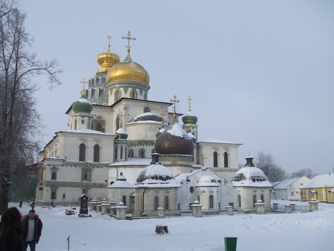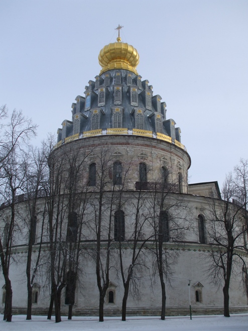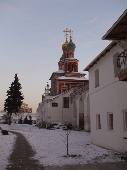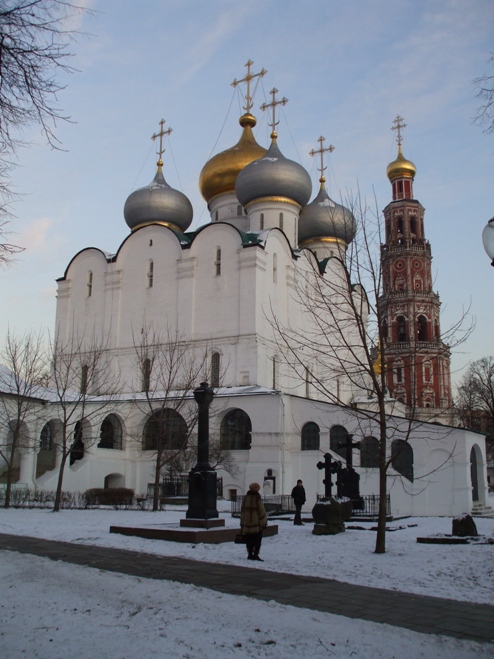 Nach dem Ikoneneinkauf sind wir mit der Metro ins Neujungfrauenkloster gefahren, das wir uns dann in der Dämmerung angeschaut haben. Es war herrlich dort - es lag für meine Verhältnisse viel Schnee, so dass wir herrliche Fotos machen konnten. Dort habe ich Sonja dann eine Bibel gekauft und dem Ludwig ein kleines Gebetbuch - beides in kirchenslawischer Schrift, um den beiden den Unterschied der Sprachen darzustellen. Mehr oder minder zum Tagesabschluss sind wir in die Vetschernaja ins Sretenskij-Kloster gefahren, wo ein sehr guter Männerchor singt. Diese fing jedoch erst eine Stunde später an als mir gesagt worden ist, so dass ich während der Liturgie, die beide sehr gut durchgestanden haben, wenn auch mit leichten Rückenschmerzen (was aber recht normal ist am Anfang), hat sich Sonja als Kerzendame sehr gut bewährt. Wir standen direkt neben einem Kerzenständer und immer wenn eine Kerze bis auf einen kleinen Rest abgebrannt war, hat sie diese ausgemacht und aus dem Ständer genommen und so die Babuschka unterstützt, die nicht an alle Kerzen drankam, weil es so voll war. Etwas befremdlich für die beiden war es jedoch, dass sie beim Ölkreuz die Ikone und die Hand des Priesters geküsst haben, eine Tradition, die wir in der katholischen Kirche nicht (mehr) kennen.
