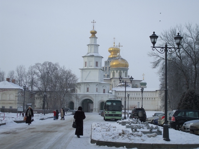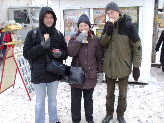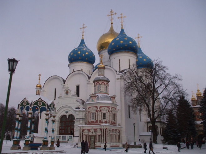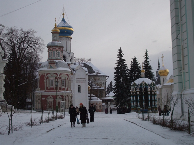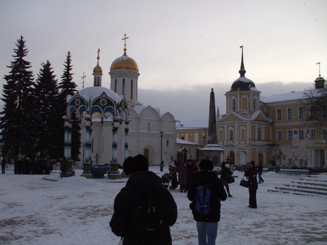 Als wir dann in Sergijew Possad angekommen sind, haben Ludwig, Sonja und ich uns zunächst ein typisches russisches Eis gekauft, dass wir zum Erstaunen der anderen drei dann natürlich auch gegessen haben, trotz der klirrenden Kälte. Dann sind wir zum Kloster aufgebrochen, wo wir dann zunächst den Markt vorm Kloster unsicher gemacht haben. Hier ist es nämlich möglich, Souvenire wesentlich günstiger zu kaufen als in Moskau auf dem Weihnachtsmarkt oder an vielen anderen Stellen - und zudem kann man hier recht gut die Preise herunter handeln, was ich wir dann auch versucht haben. Ludwig und einer von Ludgers Freunden haben sich eine russische Mütze gekauft und so einige Matrioschkas - ich selbst habe mir ein Ikonen-Ei gekauft mit dem Hl. Nikolaus, dem Patron unserer Universitätskirche. Anschließend sind wir in das Kloster gegangen und haben dort eine Fototour gemacht, da es mittlerweile schon fast vier Uhr war und es anfing, dunkel zu werden. Irgendwann wurde uns die Kälte zu viel und wir sind in die älteste der Kirchen gegangen und haben den Hl. Sergij von Radonesch dort verehrt. Die Gelegenheit haben wir genutzt, weil wir nur etwa zehn Minuten in der Warteschlange gestanden haben. Üblich sind sonst mehrere Stunden - vor allem an Feiertagen und Sonntags. Anschließend waren wir in der Studentenkirche, wo der Fakultätschor sang, wollten dann noch in die große Kirche gehen, die aber schon geschlossen war. Wir haben dann im Kloster ein Café gefunden, wo wir Tee und Kaffee getrunken haben und ich ein leckeres Gewürzgebäck gegessen habe. Das Kloster war aufgrund der Kälte nur schwach besucht, so dass es dort an diesem Tag ruhig und angenehm war - aber eben auch sehr kalt.
