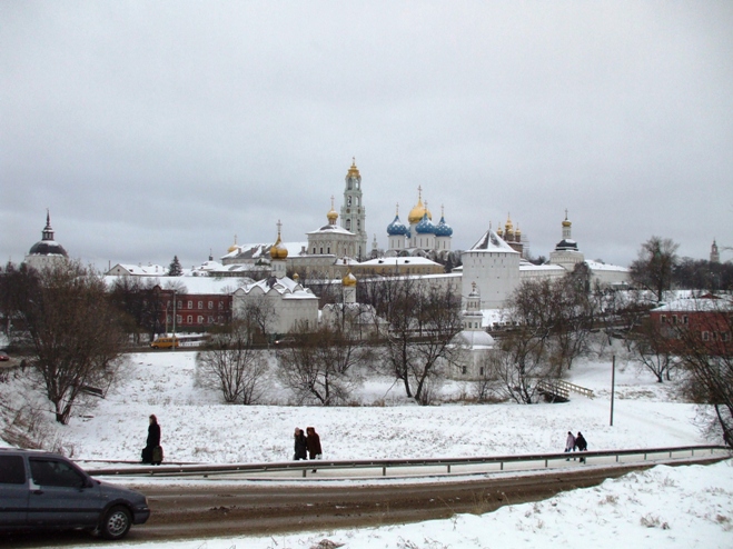 In der letzten Nacht ist wieder etwas Schnee gefallen - ich für meine Verhältnisse würde es als viel bezeichnen. Es liegen hier jetzt bestimmt über fünf Zentimeter und kalt ist es dabei auch noch. Sonja, Ludwig und ich haben uns heute morgen in der Metro-Station Textilschschiki getroffen und sind dann direkt zur Nicolai-Kirche aufgebrochen. Vorher sind wir aber noch in einem Steh-Café gewesen und haben einen Kaffee zum wachwerden getrunken. Zwischendurch rief Ludger an, da er die Kirche nicht auf Anhieb gefunden hat und es offensichtlich in der Nähe noch eine Nicolai-Kirche gibt. Während der Liturgie muss er auch irgendwann gekommen sein. Besonders imposant fanden Sonja und ich die kräftige und tiefe Stimme des Vaters Michael, der in unserer Gemeinde der Erzdiakon ist. Zur Beichte und Kommunion sind wir nach draußen gegangen, da sich alle die Beine ein wenig vertreten wollten. So gab es dann in der Kirche ein Wiedertreffen mit Sonja, Ludger und mir - alles Zielke-Schüler der Russisch-Kurse der Universität in Münster. Ludger hat uns dann mit seinen beiden Freunden bekannt gemacht, die drei sind noch einkaufen gegangen für ein Picknick im Zug und dann sind wir auch schon aufgebrochen nach Sergijew Possad. Leider konnten wir den Rest der Liturgie nicht mehr mitbekommen, weil sie eine halbe Stunde später angefangen hat und unser Zug kurz vor eins gefahren ist. Olga, die eigentlich mitfahren wollte, hat leider abgesagt, weil sie total müde und auch etwas krank war. Das fanden wir alle sehr schade. So sind wir dann zum Bahnhof gehetzt, ich habe die Fahrkarten gekauft und dann so wir recht knapp unseren Zug bekommen und dort ausführlich gegessen. Während der Zugfahrt kamen wie immer fliegende Händler vorbei - einer hat sogar Fahrpläne verkauft. Ich hatte vor einigen Wochen ja versucht, einen von der Strecke zu bekommen, aber keinen Erfolg gehabt. So konnte ich dann rechtzeitig einen guten Zug für die Rückfahrt heraussuchen. Den ganzen restlichen Tag hat es dann etwas geschneit, so dass letztendlich alles in ein weißes Gewand getaucht ist, das Wetter zum fotografieren aber leider nicht sonderlich geeignet war.
