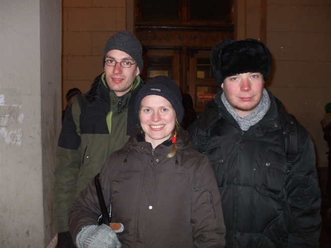 Nach dem Museumsbesuch, für den nur eine Stunde blieb, sind wir einkaufen gefahren und haben den Abend noch an meinem Internetplatz ausklingen lassen. In Abstimmung mit den Schließzeiten des Wohnheims habe ich die beiden dann zum Leningradsker Bahnhof gebracht, wo wir uns dann voneinander verabschiedet haben. Nun hoffe ich, dass sie einen vernünftigen Platz in einem guten Zug erhalten haben. Jetzt bin ich traurig, dass die Tage schon so schnell vorüber gegangen sind, da halfen noch nicht einmal die Geschenke, die ich von Dmitri und Evgenij geschenkt bekommen habe: Ein Buch über Weihnachten, eine gelbe Weihnachtskugel und einen Ikonenkalender. Aber auch wenn ich jetzt traurig bin, so will ich mich freuen über die schöne und lustige Zeit, die wir miteinander verbracht haben. Dass die beiden hier waren, war für mich ein ganz großes Weihnachtsgeschenk, an dem ich mich bestimmt noch lange erfreuen werde. Es gibt aber noch einen zweiten Punkt: Nun habe ich es selbst das erste Mal richtig geschafft, die Sehenswürdigkeiten in Moskau zu fotografieren und zu bestaunen - auch wenn ich davor schon viel gesehen habe. Aber so komprimiert und auf ein paar Tage zusammengequetscht war es für mich eine Premiere.