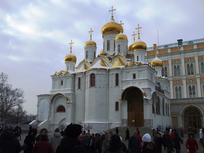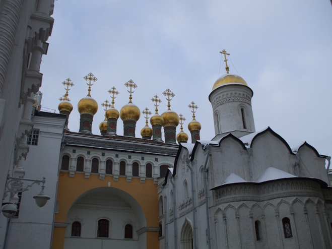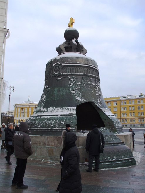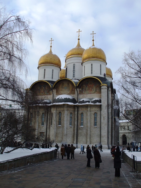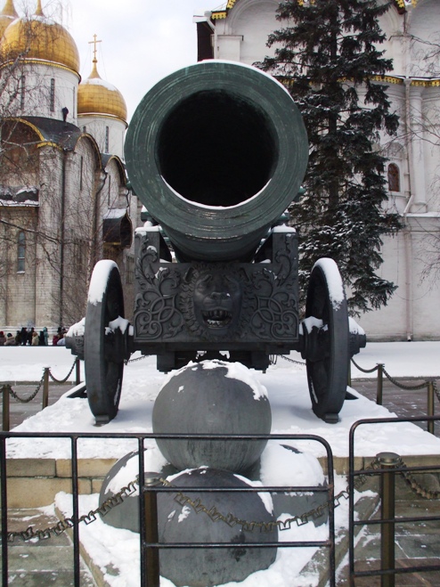 Heute Morgen rappelte wieder um sieben Uhr der Wecker, ich habe aber erst zehn Minuten später die Überwindung gefunden, aus dem Bett zu steigen. Nach den morgendlichen Ritualen - Waschen, Frühstück mit Ostfriesentee, Rasieren, Sachen packen - bin ich dann pünktlich, aufgrund einer Verspätung der Elektritschka, in der Station Textilschschiki angekommen und wurde dann von Sonja angerufen, dass ich doch ins Hotel kommen solle, weil sie noch einige Fragen hätte. Anschließend sind wir dann direkt zum Kreml gefahren und haben Eintrittskarten gekauft. Hätte ich doch bloß gewusst, dass der internationale Studentenausweis gültig ist, so hätte wenigstens Sonja weniger bezahlen müssen. Als wir die Karten hatten, durften zunächst nur Kinder herein und wir haben uns dorthin gestellt, wo ich den Einlass vermutet habe. Als es dann losging, mussten wir uns noch einmal ganz hinten anstellen. In dem Moment hatte ich dann wieder die Warteschlange beim Abschiednehmen vom Patriarchen Alexej II. vor Augen. Wir haben dann aber schnell den Kutafija-Turm hinter uns gelassen und sind über die Brücke, die einmal über einen Fluss führte, der jetzt unterirdisch verläuft, durch den Troizkij-Turm in den Kreml gelangt. Vor uns tat sich dann der Neueste Bau im Kreml auf, nämlich der große Kremlpalast, ein Bau aus Sowjetzeiten. Das Haus wird durch einen goldenen Adler geschmückt. Links an den Mauern des Arsenals waren dann verschiedenen Kanonen zu sehen, die einst den Kreml geschützt haben. Die dickste und größte, die Zarenkanone, dagegen ist von absolut beeindruckender Größe, ebenso die schwerste Glocke der Welt, die Zarenglocke. Aus ihr ist ein Stück herausgebrochen, nachdem sie bei einem Brand aus dem Turm gefallen ist, eingeschmolzen wurde und bei einem weiteren Unfall dann zerbrach. Anschließend waren wir in der Erzengelskathedrale, wo Fürsten und Zaren aufgebahrt werden. Wenn die Kirche doch recht gut erhalten ist, so merkt man, dass sie in unliebsamen staatlichen Händen ist. Es sieht dort längst nicht so feierlich aus, wie in einer Kirche in der kirchlicher Hand. Ich fand es dort ziemlich rumpelig und lieblos gepflegt. Diesen Eindruck hatte ich auch von der Maria-Entschlafungskathedrale, wo der Zarenthron, der Patriarchenthron und der Thron von Iwan dem Schrecklichen zu sehen sind. Auch hier war alles gut erhalten, aber lieblos aufgemacht und für eine Kirche eher traurig anzusehen. Vor den Ikonen brannten übergroßes elektrisches Licht, die Kerzenleuchter sind verwittert und glanzlos - da zeigt sich die liebevolle Arbeit der Babuschkas in den anderen "kirchlichen" Kirchen doch stark. So prächtig der Kreml an vielen Stellen auch ist, in den Kirchen hat es mir nicht sonderlich gut gefallen. Inzwischen hatte wieder Schneefall eingesetzt und so sind wir dann in die Rüstkammer des Kremls gegangen, wo ich schon eher einmal mit Elena war.