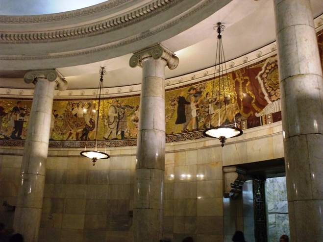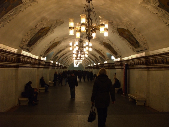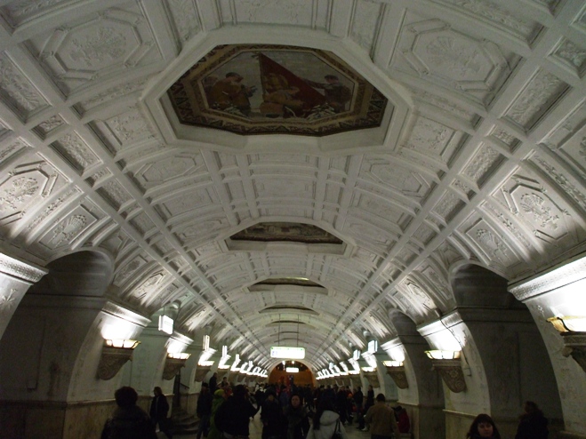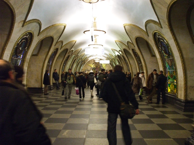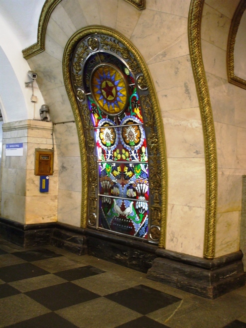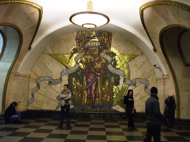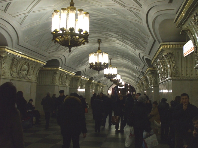 Auch dieser Tag begann wieder um sieben Uhr und um 9:30 Uhr habe ich Ludwig und Sonja an der Station Pererwa abgeholt, damit sie ihre Sachen bei mir einschließen konnten. Die Administratorin des Wohnheims hat sogar erlaubt, dass Sonja mit in unseren Männertrakt darf und so konnte ich ihnen zeigen, wie ich hier lebe. Dann sind wir in die Stadt gefahren und haben uns noch einmal den Roten Platz angeschaut und anschließend wollten wir in die noble Einkaufsstraße Arbat gehen, sind aber in der Tverskaja Uliza gelandet, was ich viel zu spät gemerkt habe, so dass wir den Arbat dann drangegeben haben. Dort haben wir das Museum für neue Zeitgeschichte gesehen, das Sonja und Ludwig sich auch noch gerne anschauen wollten, sind dann aber zur Post weitergelaufen und haben danach einige Metrostationen besichtigt - zunächst die Station "Majakovskaja", dann "Belorusskija", "Novoßlabodskaja" und die Station "Prospekt Mira". Auf dem Weg zur nächsten Station - "Dobrininskaja" haben wir in der Mensa Rast gemacht und zu Mittag gegessen und nach dem Essen die Deutschprofessorin Ludmilla Simonovna getroffen, die begeistert von Bayern erzählt und damit bei meinen Gästen voll ins Schwarze getroffen hat. Bevor den Museumsbesuch angegangen sind, haben wir noch uns noch die restlichen Stationen der Ringlinie angeschaut, wobei die Station "Kiewskaja" die bei weitem Schönste und prächtigste ist. Zwischendurch wurden wir von der Miliz aufgehalten, weil es angeblich verboten ist, dort zu fotografieren. Nach einer Passkontrolle bei Sonja und mir und dem Löschen des gemachten Fotos durften wir dann wieder gehen und ich habe unauffällig weiter fotografiert, wobei Sonja und Ludwig Schmiere gestanden haben, falls die Miliz auftaucht. Den prächtigen Kiewer Bahnhof haben wir uns auch angesehen und sind dann noch zu den Stationen "Park Pobedij" und "Clavanskij Boulvard" herausgefahren, weil es dort auch schöne Stationen gibt - aber alle ebenfalls von der Miliz bewacht, so dass wir aufgrund der wenigen Fahrgäste nur eingeschränkt fotografieren konnten.