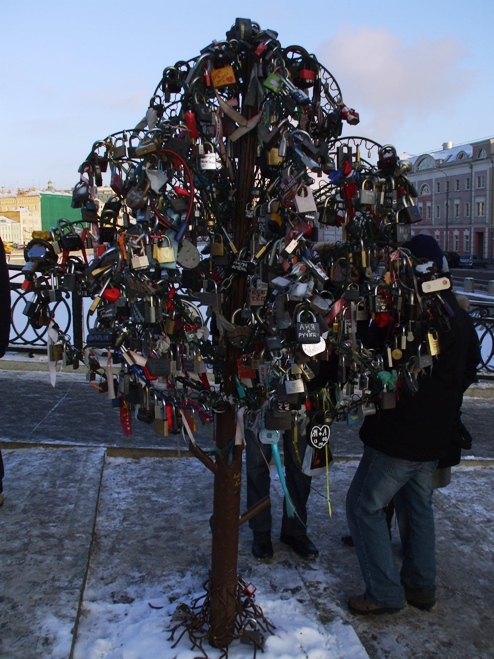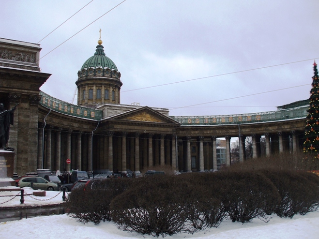 Nach dem Essen haben wir das Eisenbahnmuseum besucht, das wir am Vorabend im Internet gesucht hatten. Es war ein Museum, dass einen Eindruck machte, als hätte man dort in den letzten Jahren nur das Türschild ausgetauscht, das darauf hinweist, dass es ein Museum der Russischen Föderation und nicht des UDSSR ist. Sonst scheint sich dort nicht viel getan zu haben. Lediglich ein paar Fotos zu deren ICE, der derzeit in Deutschland produziert wird und dann zwischen Moskau und St. Petersburg fahren soll, hängen dort. Leider sind dort auch fast nur Modelle ausgestellt - "echte" Ausstellungsstücke wie originale Lokomotiven, die mich interessiert hätten, gab es keine. Interessant fand ich aber, dass es dort Eisenbahnmagazine zu kaufen gab - mit Bildern von der Deutsch-Niederländischen Grenzstation Bad Bentheim. Anschließend wollte mir Lena im Leninskij Cad (Leninsker Garten) Skulpturen zeigen, die aber alle winterfest in einer übergestülpten Holzkiste verharrten. So sah der Garten aus wie eine Ausstellung dieser grauen Kisten. Anschließend wollten wir wieder in die Vetschernaja - es ist ja immer noch die orthodoxe Weihnachtszeit, in der sich die Feiertage nur so häufen. Wir sind letztlich wieder in der Troizkij-Kirche gelandet, weil die Kasaner Kirche im Stadtzentrum zu einer Zeit Liturgie hat, die mit dem Abendessen kollidiert. Auf dem Weg zur Kasaner Kirche haben wir noch in der armenisch-orthodoxen Kirche hineingeschaut, deren Altarraum völlig anders aussieht als der einer Russisch-orthodoxen Kirche. Dennoch hangen dort ein paar Ikonen - mit arabischer oder griechischer Beschriftung, nur standen dort keine Kerzenständer davor. Die standen für alle Ikonen in der Mitte der Kirche. Interessant fand ich, dass manchmal drei Kerzen dicht zusammen gestellt wurden. Dieses Zeichen, das wohl die Dreifaltigkeit darstellen soll, habe ich bislang in noch keiner orthodoxen Kirche gesehen.