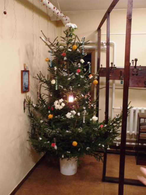 Zurück im Wohnheim habe ich dann schnell Pizzabrote, Salat und Obstsalat zubereitet und mein Zimmer zu Ende hergerichtet. Und dann habe ich mit Oleg, Dmitri, Pjotr, Stephan und Evgenij gemeinsam Weihnachten gefeiert. Nach dem Essen haben wir "Stille Nacht, Heilige Nacht" gesungen und dann habe ich die Geschenke - für jeden ein Kreuz und eine deutsche Bibel - verteilt und meine geöffnet. Darin enthalten waren jede Menge Schwarzbrot und andere Brotsorten, selbstgebackene Kekse, Foto-CD's Zeitungsausschnitte, Sachen vom Gallimarkt, Marzipan, Süßigkeiten - alles Sachen, die nicht zurück in die Heimat müssen! Nun ist mein Lebensmittelschrank wieder voll aufgefüllt und ich werde zukünftig die Türe wohl gut abschließen müssen. Und ganz zum Schluss des Abends - hier quasi um kurz vor zwei in der Nacht - noch nach Hause telefoniert. Alles in allem war es ein schöner Abend, nur der kirchliche Teil hat mir überhaupt nicht gefallen.