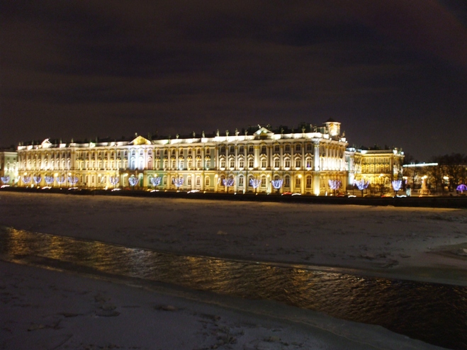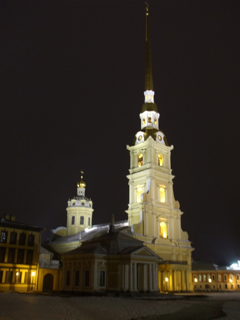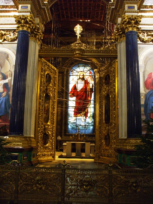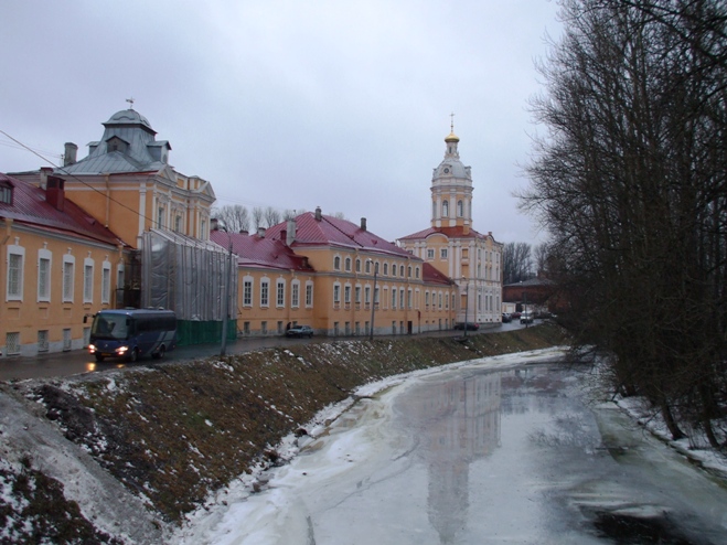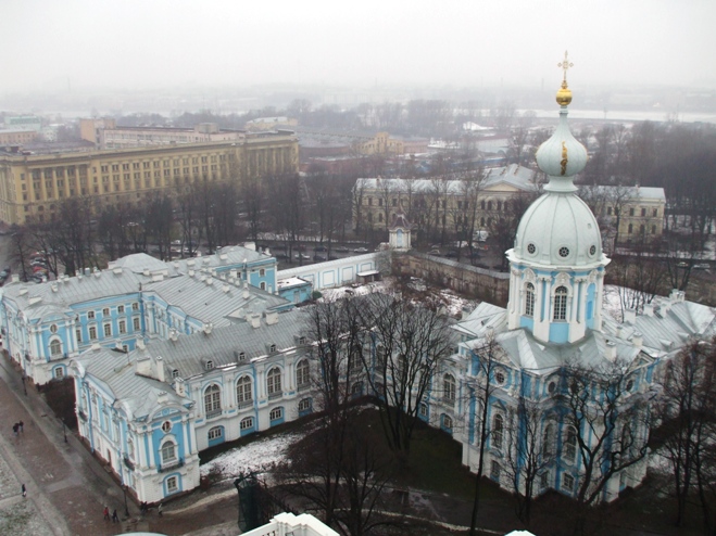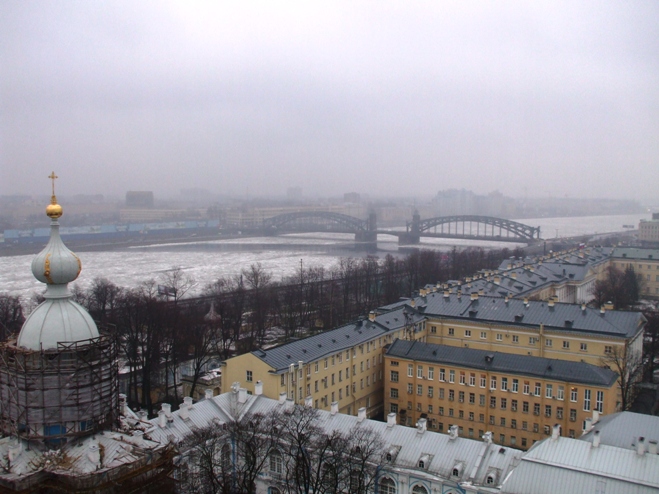 Anschließend sind wir an der Uferstraße der Njeva zur Smolny-Kathedrale gegangen, die etwa eine halbe Stunde Fußweg entfernt war. Auf dem Weg dorthin, habe ich immer wieder die großen Eisschollen bewundert, die auf dem Fluss lagen. In der Smolny-Kirche angekommen konnten wir nicht ins Innere der Kirche, dafür aber auf den Glockenturm. Leider war die Sicht äußerst bescheiden, so dass wir nicht viel von St. Petersburg gesehen haben, aber schön war es trotzdem. Anschließend sind wir auf dem Weg zur Peter-Paul-Kirche an einigen Kirchen vorbei gekommen, die wir uns angesehen haben. In einer haben wir sogar eine Krippe entdeckt, die kitschig-schön fand. Bei näherem Hinsehen konnte man die Figuren schon fast für karikiert halten, sie wirkten etwas "überzeichnet". Nachdem wir in einer anderen Kirche waren, die gerade renoviert wurde, haben wir unsere Besichtigungstour am frühen Abend abbrechen müssen, weil es anfing zu regnen und zu schneien und wir ziemlich schnell nass waren. Auf einer Temperaturanzeige habe ich gesehen, dass an dem Tag nur +4°C waren. So sind wir dann zurück ins Priesterseminar gefahren und sind dann in die Vetschernaja in die Dreifaltigkeitskirche gefahren, da ja am kommenden Tag das Fest des Heiligen Basilius des Großen ist, nach dem ja eine Liturgie benannt ist, die nur selten an besonderen Feiertagen gefeiert wird.