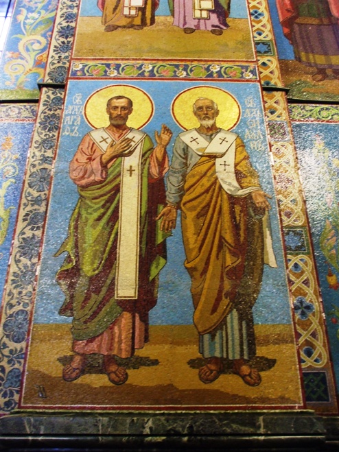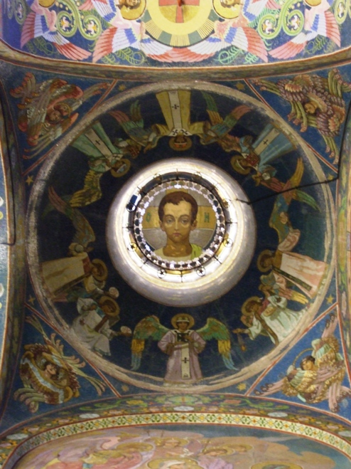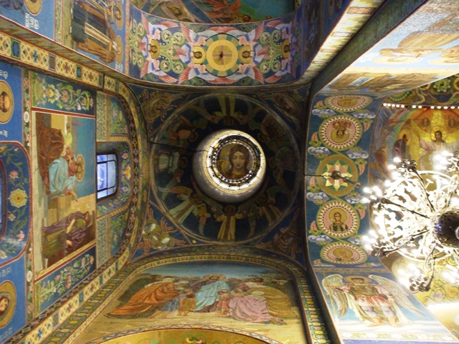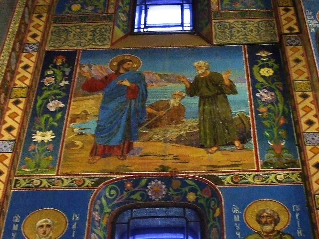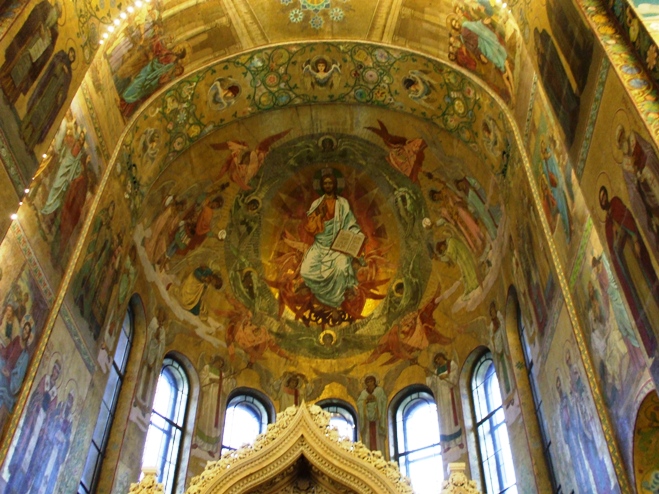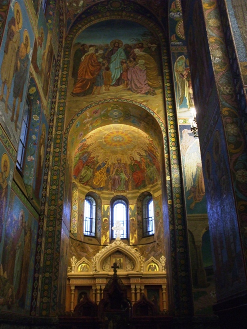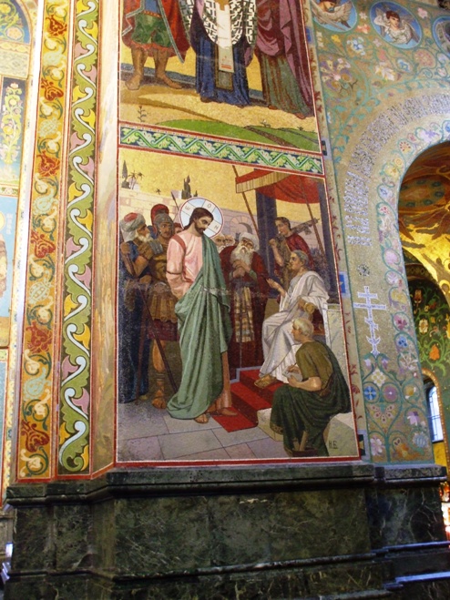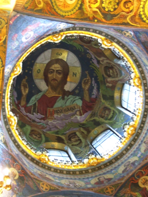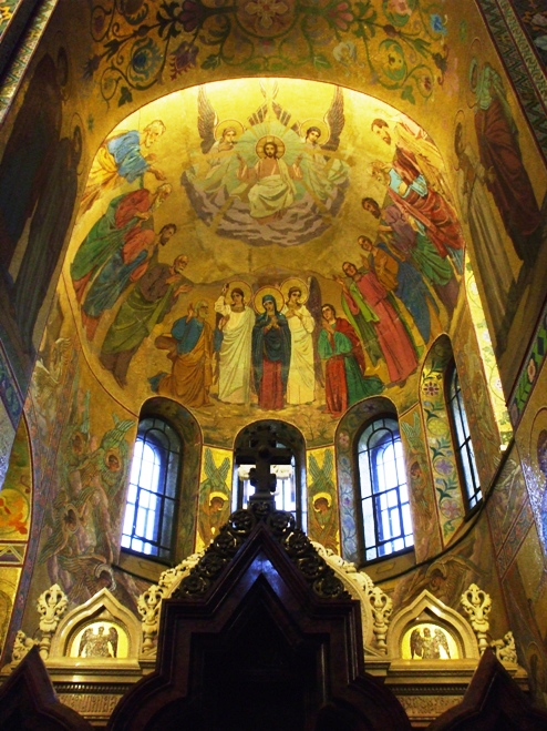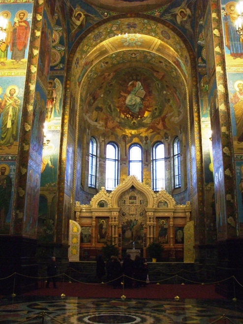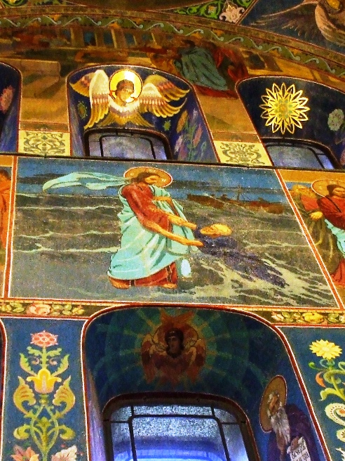 Noch in der Kirche haben wir beschlossen, dass wir uns die anderen drei Kirchen auch anschauen, die auf der Rückseite der Eintrittskarte abgebildet waren. Ich hätte nicht gedacht, dass die Isaaks-Kirche zu übertreffen gewesen wäre, aber dies war doch noch möglich: Die Erlöser-auf-dem-Blut-Kirche war noch prächtiger anzusehen von innen - alles ab einer bestimmten Höhe (so etwa ab zwei Metern) waren Mosaike - selbst die Fensterzwischenräume. Die Ikonen zeigten viele Heilige und vor allem Szenen aus dem Evangelium - eigentlich wurden alle wichtigen Lebensstationen Jesu dargestellt. Eine solch aufwendige Kirche habe ich noch nicht vorher gesehen - und auch keine so schöne wie diese. Kaum auszumalen,wie es sein muss, wenn dort die Göttliche Liturgie gefeiert würde. Aber leider ist dies gar nicht oder sehr selten der Fall, denn diese Kirche ist bislang nicht zurückgegeben worden, auch nicht ein Seitenaltar. Interessant ist auch, dass die Engel als Priester oder Diakone dargestellt werden und die Apostel als Bischöfe. Aus dieser Kirche mochte ich überhaupt nicht mehr herausgehen, so schön war es dort. Vor allem habe ich immer wieder die Szenen aus dem Evangelium bestaunt. Es muss unheimlich schön sein, die Bibel in dieser Kirche zu lesen und dazu die einzelnen Ikonen zu betrachten!