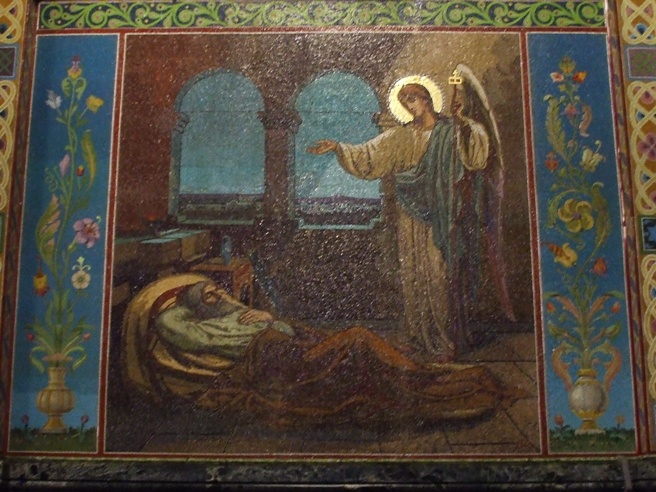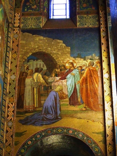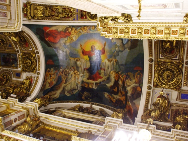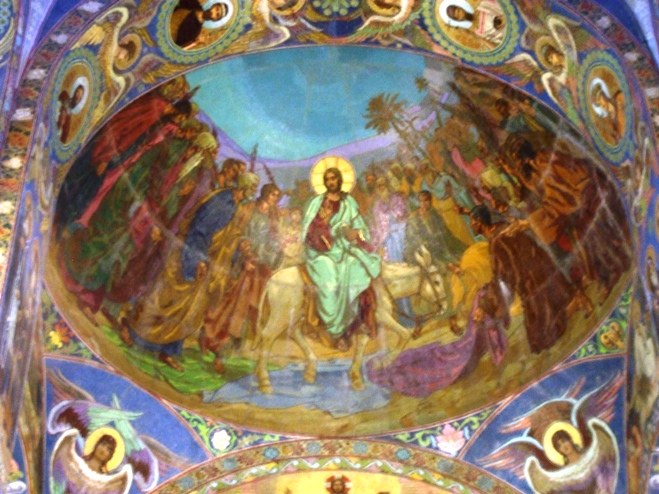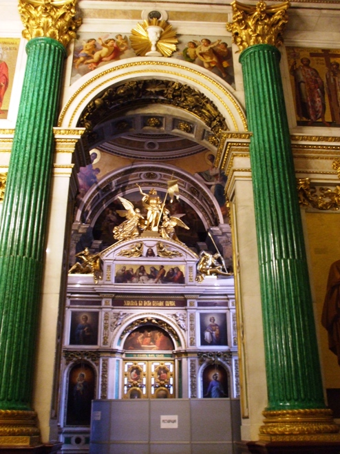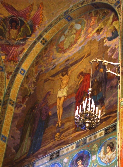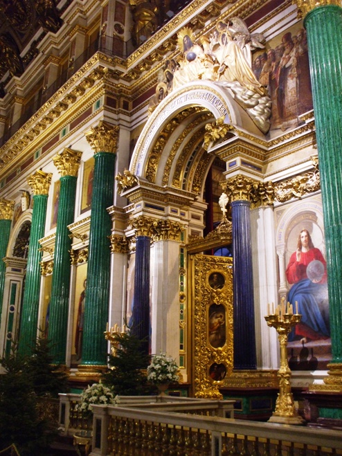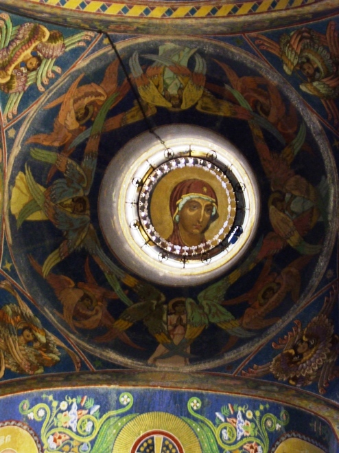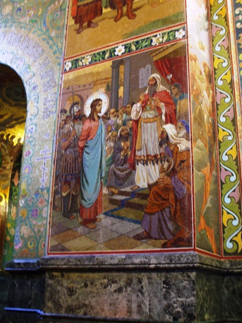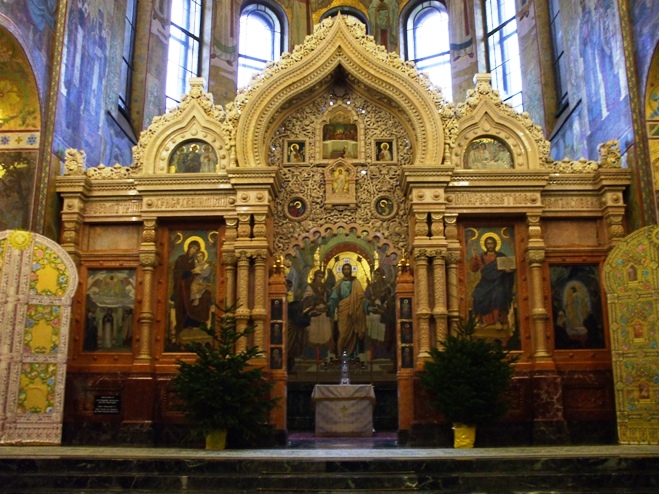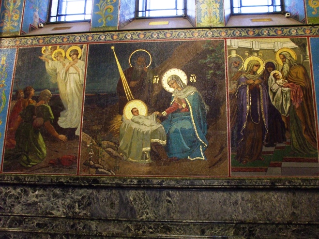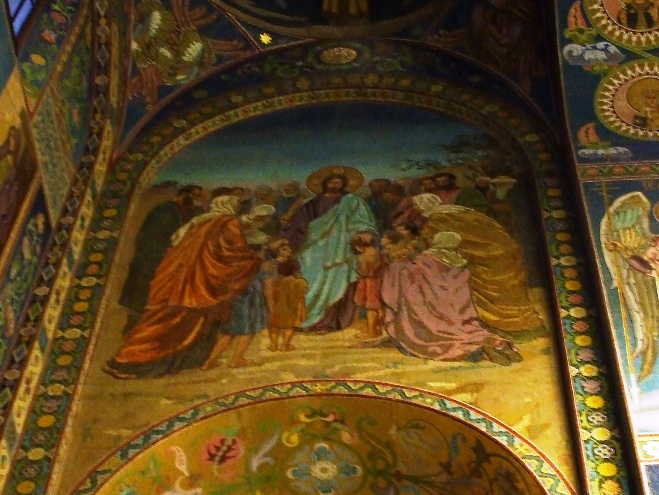 Noch in der Kirche haben wir beschlossen, dass wir uns die anderen drei Kirchen auch anschauen, die auf der Rückseite der Eintrittskarte abgebildet waren. Ich hätte nicht gedacht, dass die Isaaks-Kirche zu übertreffen gewesen wäre, aber dies war doch noch möglich: Die Erlöser-auf-dem-Blut-Kirche war noch prächtiger anzusehen von innen - alles ab einer bestimmten Höhe (so etwa ab zwei Metern) waren Mosaike - selbst die Fensterzwischenräume. Die Ikonen zeigten viele Heilige und vor allem Szenen aus dem Evangelium - eigentlich wurden alle wichtigen Lebensstationen Jesu dargestellt. Eine solch aufwendige Kirche habe ich noch nicht vorher gesehen - und auch keine so schöne wie diese. Kaum auszumalen,wie es sein muss, wenn dort die Göttliche Liturgie gefeiert würde. Aber leider ist dies gar nicht oder sehr selten der Fall, denn diese Kirche ist bislang nicht zurückgegeben worden, auch nicht ein Seitenaltar. Interessant ist auch, dass die Engel als Priester oder Diakone dargestellt werden und die Apostel als Bischöfe. Aus dieser Kirche mochte ich überhaupt nicht mehr herausgehen, so schön war es dort. Vor allem habe ich immer wieder die Szenen aus dem Evangelium bestaunt. Es muss unheimlich schön sein, die Bibel in dieser Kirche zu lesen und dazu die einzelnen Ikonen zu betrachten!