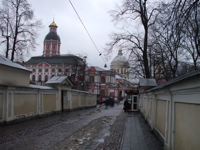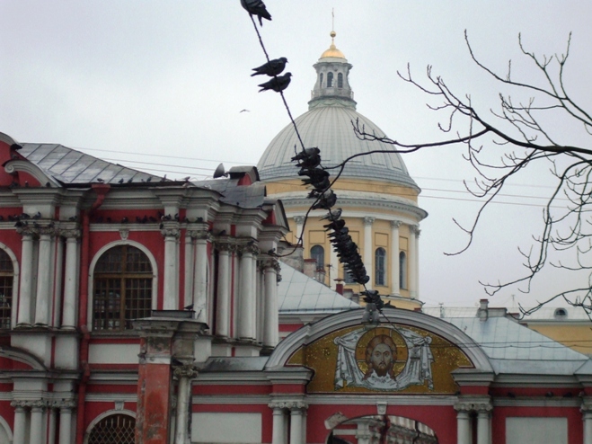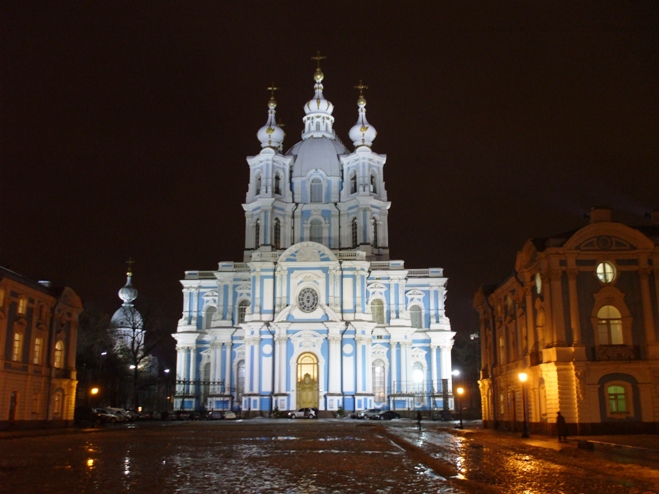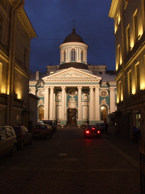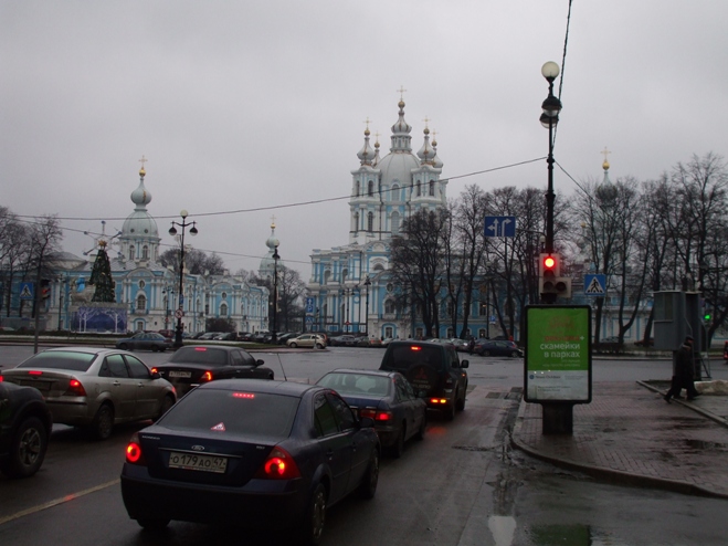 Anschließend wollten wir noch zur Smolny-Kathedrale fahren. Auf dem Weg dorthin haben wir noch eine andere, normale orthodoxe Kirche gesehen und sind dann, weil es zu weit zum laufen war, mit dem Marschroute-Taxi dort hin gefahren. Vor der Kirchentüre gab es dann allerdings eine ernüchternde Nachricht: Wir wurden nach einer Einladung gefragt - da fand doch tatsächlich in der sich in staatlicher Hand befindenden Kirche eine private Party statt und hatte geschlossen. Lena war deswegen recht verärgert, da es nach wie vor ein Gotteshaus ist. Anschließend sind wir ins Priesterseminar gefahren und haben dort gegessen. Da es heute sehr wenig gab, sind wir anschließend noch kurz bei Mc Donalds eingekehrt und haben dort noch eine Kleinigkeit gegessen. Anschließend haben wir geschaut, wann morgen in der Dreifaltigkeitskirche (Troizkij-Kirche) die Vesper stattfindet, zu der wir unbedingt gehen wollen. Den Rest des Abends haben wir mit Fotos schauen und dem Hören der Liturgie in deutscher Sprache verbracht, was für uns sehr interessant war: Für mich war es kein Problem mehr zu erkennen, was gerade gesungen wird und für Lena war es interessant zu hören, wie es auf deutsch klingt und es dann zu übersetzen ins kirchenslawische.