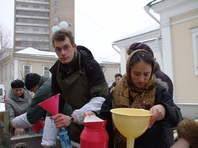 Am gestrigen Abend habe ich mich entschieden, zu sieben Uhr zur Fakultätskirche zu fahren, um dort die Göttliche Liturgie zum Fest mitzuerleben. So bin ich um viertel vor sechs aus dem Bett gefallen, habe schnell gefrühstückt und bin dann schnellsten Weges zur Kirche gefahren, wo die Liturgie schon im vollen Gange war - sie war schon um 6:30 Uhr angefangen. Zu meiner Überraschung waren vier Priester und drei Diakone dort anwesend, so dass alles in einem sehr feierlichen Rahmen gehalten wurde. Während der Liturgie fragte mich einer der Mädchen, die in die Kirche halfen, ob ich nach der Liturgie nicht auch helfen könne. Ich habe für eine Stunde zugesagt, obwohl ich nicht wusste, was auf mich zukam. Bis zur Eucharistie war die Kirche dann auch sehr voll, was die Bedeutung des Festes noch einmal wieder spiegelt - es wird in etwa den gleichen Status haben wie Weihnachten. Zum Ende der Liturgie wurde dann das Wasser gesegnet - es wurde eine Lesung und das Evangelium gelesen, jeder Priester segnete das Wasser und danach noch einmal, indem sie ein Kreuz in das Wasser tauchten. Dazu stand ein großer Bottich in der Kirche, mit einem Kreuz, aus dem wie ein kleiner Springbrunnen Wasser sprudelte. Und dann wurden wir mit dem Wasser gesegnet - in üblicher Form mit einem Pinsel - nur ging der Priester dieses Mal sehr langsam durch die Reihen und so wurde jeder ausreichend gesegnet. Anschließend wurde mir eine Schürze umgebunden und Armmanschetten umgelegt und dann wurde ich nach draußen geschickt, wo schon viele Leute in einer langen Schlange darauf warteten, aus einem großen Becken Wasser in Flaschen und andere Behälter gefüllt zu bekommen. So habe ich dann etwa eine Stunde bei -5°C und leichten Schneefall draußen gestanden und unzählige Flaschen gefüllt. Masha und ihre Schwester haben mir dann dabei geholfen. Und die Schlange wollte überhaupt kein Ende nehmen. Und das Wasser in dem Bottich wurde auch nicht weniger - obwohl ich keinen Zufluss "auf die Schnelle" gesehen habe. Einmal war das Becken halb leer, bis es dann auf einmal wie mit Geisterhand wieder randvoll war. So wird wohl, wie in der Gemeinde "Hl. Märtyrerinnen Vera, Nadjeschda, Ljuba und Mutter Sofia" Schläuche quer durch die Kirche gelegt und mit Teppichen versteckt waren, eine ebensolche Einrichtung versteckt gewesen sein, die ich aber nicht gefunden habe. Es war nur fürchterlich kalt und nach der Stunde waren meine Hände ganz schön kalt.