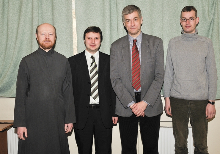 In der Universität hat Professor Bremer einen Vortrag über die Universität und die Theologische Fakultät in Münster gehalten - anschließend konnte das Auditorium Fragen stellen. Dabei sind teilweise sehr interessante Fragen gestellt worden, sowohl von Studenten als auch von Dozenten und Professoren. Besonders habe ich mich darüber gefreut, dass das orthodoxe Pendant zu Professor Bremer, Vater Valentin, auch da war. Nach dem Treffen, das gute eineinhalb Stunden dauerte, sind wir dann dort zum Essen eingeladen worden, wo die "Väter", also die Priester der Universität, essen oder sich aufhalten. Mit dabei waren Ludmilla Simonovna, Vater Valentin, Juri Valerjewitsch, Vater Andrej (den ich bis dahin noch nicht kannte) und die Mitarbeiterin von Ludmilla Simonovna, deren Namen ich mir einfach nicht behalten kann. Bei Borschtsch und Kartoffelpüree mit überbackenem Fisch und Wein gab es ein gemütliches Beisammensein, bei dem dann und wann ein Trinkspruch gesagt wurde. Interessant fand ich die Atmosphäre in dem Haus: Es war zwar alles renoviert und sah gut aus, aber ebenso auch ein wenig unordentlich: Der Tisch war nicht sauber, es standen noch Essenreste herum und eigentlich musste erst aufgeräumt werden, bevor wir dort essen konnten. Mir war es ein wenig unangenehm, nicht helfen zu können oder zu dürfen. Sobald ich derartige Anstalten machte, wurde ich gebeten, mich zu setzen. So wurde mir der Wein von Vater Valentin eingeschenkt, das Essen durch Ludmilla Simonovna und Juri Valerjewitsch gereicht. Und für meinen Geschmack wurde ich viel zu viel während des gesamten Treffens gelobt. Besonders in Erinnerung ist mir der Satz von Vater Valentin an Prof. Bremer in Erinnerung geblieben, als er gesagt hat: "Wir werden Andreas im Sommer aber wieder zurückgeben." Für mich war dies ein guter Einblick heute, wie hier über mich gedacht wird - Ludmilla Simonovna drückte es so aus, dass hier wohl oft "von unserem Andrej" gesprochen wird. Der Satz zeigte mir doch, dass ich hier gut aufgenommen bin und mich ganz geborgen fühlen darf. Alles in allem war es ein sehr schönes Treffen, dass mich noch einmal in meiner Sache bestärkt hat. Anschließend habe ich Professor Bremer noch die Fakultätskirche und die Studentenkirche gezeigt - bei letzterer insbesondere die Wandgemälde, die von der entsprechenden Fakultät dort gemacht wurden. So habe ich heute auch erfahren, dass die Fakultätskirche St. Nicolai eine der wenigen Kirchen in Moskau gewesen ist, die während der Sowjetzeit geöffnet gewesen und damit etwas Besonderes ist. Ein Bericht auf der Seite der Universität befindet sich unter: http://pstgu.ru/news/university/2009/02/26/14027/.