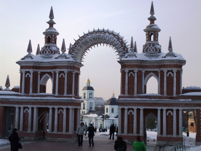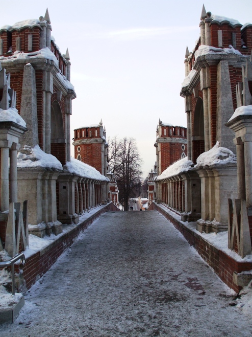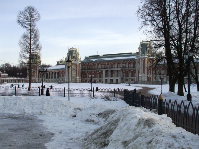 Daraufhin bin ich wieder bei Masha zu Hause gewesen, wir haben zusammen gegessen und anschließend eine ruhige Pause eingelegt. Am Nachmittag sind wir nach Zarizino in den Park gefahren, wo ich abends einmal kurz mit Sonja und Ludwig war, und sind dort spazieren gegangen. Die Parkanlagen dort sind wirklich sehr schön - vor allem habe ich noch einmal den Schnee genossen, der jetzt so nach und nach langsam schmilzt und weniger wird - denn tagsüber herrscht momentan Tauwetter. Dort kann man wunderschön und sogar recht ausgedehnt spazieren gehen - es ist ein Ort in Moskau, wo es an diesem Tag recht ruhig und beschaulich zuging. Das Schloss und die Parkanlagen sind erst vor ein paar Jahren wieder hergestellt worden, so dass alles noch sehr neu und schön aussieht.