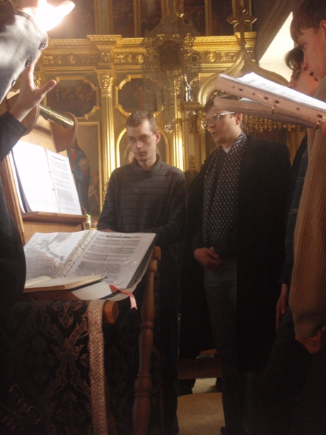 Die Chorstunde war für mich an diesem Tag sehr, sehr schwer, weil wir uns weiter auf den Donnerstag vorbereitet haben und nur Texte in kirchenslawischer Schrift ohne mir bekannte Noten gesungen haben. Dazu kam, dass ich nicht einen Text davon gekannt habe. Ein weiteres Problem war, dass es nur wenig Liedermappen gab und mein heutiger Nachbar immer mehr mit anderen Dingen beschäftigt ist und die Mappe nicht so hält, dass wir beide lesen können, sondern sie schwirrt dann im übertriebenen Sinne gesagt quer in der Weltgeschichte herum. Weil er so unkonzentriert ist, konnte mir auch nie richtig sagen, wo und was wir gerade singen.