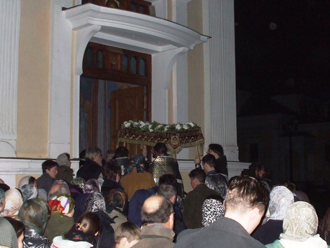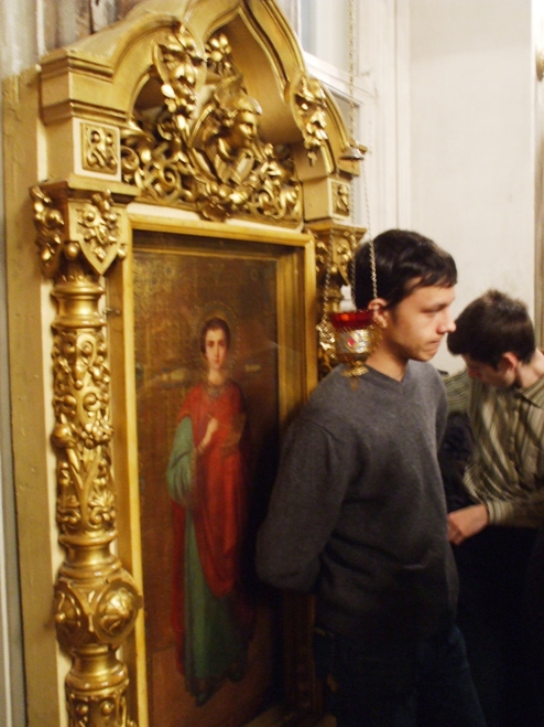 An diesem Abend ist in der Fakultätskirche noch etwas ganz besonderes passiert: Eine Ikone des Hl. Nikolaus hat Myron gegeben: Dann befindet sich auf einmal ein Tropfen an der Scheibe, der einen starken, aber recht angenehmen Geruch hat. Ich selber habe das nur noch gerochen und den Tropfen selbst nicht mehr gesehen, weil ihn viele Nasen vor mir schon platt gedrückt haben. In der Sowjetzeit haben insbesondere alte oder berühmte Ikonen hin und wieder Myron gegeben und auch heute ist dies manchmal der Fall. Diese Ikonen sind in den Kirchen dann etwas ganz Besonderes - und auch, wenn sie Myron geben. Dann werden sie von den Gläubigen sehr tief verehrt.
