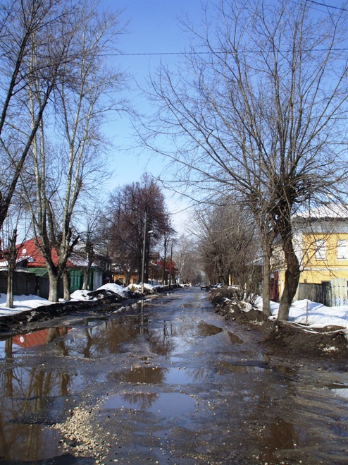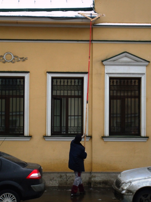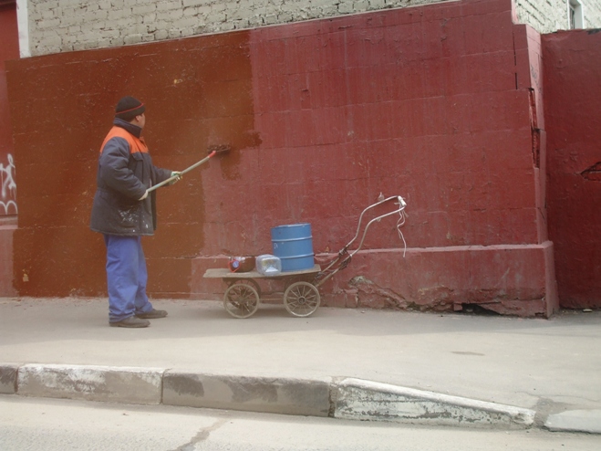 Nun ist mir in den letzten Tagen aufgefallen, dass sich Russland für den Frühling oder für das Osterfest herausputzt. An jeder Ecke und Kante wird mit oft fürchterlich stinkender Lackfarbe alles gestrichen, was man nur streichen kann: Türen, Zäune, Hauswände und sogar wieder die Bordsteinkanten. Nicht überall gibt es einen Hinweis, dass gestrichen wurde. So muss man sehr aufpassen, dass man nicht seine Sachen versaut. Die Weise, wie gestrichen wird, kommt mir sehr fremd vor: Es wird vorher nichts gereinigt oder abgeschliffen, die Farbe wird einfach neu aufgetragen - möglichst dick natürlich. So verschwinden nach und nach Verzierungen, da sie durch die dicke Farbschicht einfach verdeckt werden. Heute Abend war die ganze Novokusnetskaja Uliza voll mit Reinigungspersonal - es wimmelte fast nur so von Menschen mit orange leuchtenden Warnwesten.