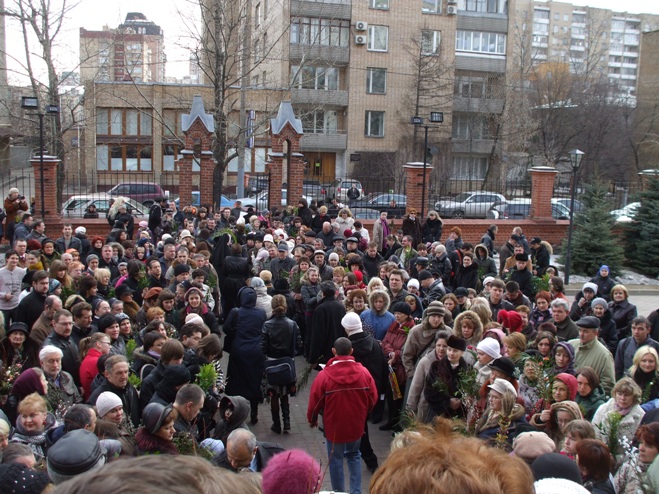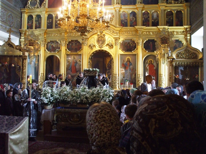 An diesem Tag wurden zwei Feste begangen - zum einen der staatliche Frauentag und das kirchliche Fest zu Ehren der orthodoxen Christenheit. Ersteres hat in der orthodoxen Kirche kaum eine Bedeutung, weil es ein staatliches Fest ist und die Wurzeln im Kommunismus zu finden sind. Ich habe heute in der "nicht-orthodoxen Welt" eine Menge Frauen gesehen, die Blumen in der Hand getragen haben und an jeder Ecke standen Blumenverkäufer mit Tulpen und Rosen. In der orthodoxen Kirche dagegen wurde heute die Göttliche Liturgie nach Basilius dem Großen gefeiert und im Anschluss ein Gottesdienst zum Lob auf das orthodoxe Christentum gefeiert. Diese beinhaltete Gebete für die lebenden und verstorbenen Patriarchen der verschiedenen orthodoxen Kirchen, für die Bischöfe, das Kirchenvolk und es wurde auch ein kurzer Anathemagesang gesungen. Zu dieser Liturgie gehörte auch eine Lesung und das Evangelium und vor allem das Glaubensbekenntnis. Dies alles geht auf das siebte ökumenische Konzil zurück. Es schien, als hätte sich Vater Michael besonders auf den Gottesdienst gefreut, denn er lächelte vor und nach seinem Gesang still vor sich hin. So konnte er wieder seine ganze Stimmgewalt unter Beweis stellen, was ihm sehr eindrucksvoll gelungen ist.