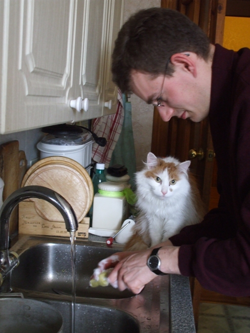Die Nacht habe ich wunderbar durchgeschlafen und ich war sehr überrascht, als um sechs Uhr schon der Wecker klingelte. Ich habe mich schnell frisch gemacht und mir dann etwas zu essen. Leider war kein Brot mehr da, so dass ich auf im Kühlschrank stehende Kartoffel zurückgreifen musste. Während dem Essen gesellte sich Mashas Kater zu mir auf die Bank und schaute mir sehnsüchtig beim Essen zu. Bis sich dann auf einmal die rechte Vorderpfote langsam erhob und in die Richtung meines Tellers steuerte. Ich habe die Pfote dann dahin zurückgetan, wo sie hingehört und nach kurzem Warten hat er es wieder probiert. Dann habe ich in von der Bank verscheucht. Dieser Kater hat einen total frechen Charakter: Die anderen Katzen ärgern, unschuldig und lieb schauen und wenn man nicht aufpasst, dann macht er Unsinn - bei mir mittlerweile auch schon, wenn ich dabei bin. Und sobald ein Fremder die Wohnung betritt, dann versteckt er sich so lange, bis der wieder weg ist. Er ist ein großer Frechdachs und ein Feigling zugleich.