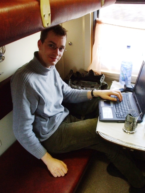 Anschließend herrschte etwas Mittagsruhe und ich habe draußen in der Sonne das Tagebuch für gestern und für heute geschrieben und mich ein wenig mit dem sehr verspielten und jungen Wachhund "Kommissar" Rex gespielt - und den ersten Schmetterling des Jahres gesehen: einen Zitronenfalter! Kurz nach vier kam Bischof Clemens und wir haben uns voneinander verabschiedet und der Allroundgehilfe Karen hat mich dann zum Bahnhof nach Saratov gebracht. Ich wollte eigentlich Masha und Tanja auf dem Handy anrufen, doch ich hatte wohl zu wenig Guthaben - zumindest zeigte es einen Minusbetrag von mehr als 90 Rubel an. Wieso hat keiner von uns verstanden. Nachdem es aufgeladen war, konnte ich dann auch meine Eltern anrufen, die bei Oma zu Gast waren. So konnte ich ihr dann auch gleich ein frohes Osterfest wünschen. Letztlich haben wir die beiden am Prospekt Kirov aufgelesen. Nachdem ich noch geschaut habe, welche Lokomotive uns die erste Etappe nach Moskau bringen sollte, sind wir in den Zug eingestiegen. Kurz nachdem wir saßen - wir haben uns auf Deutsch unterhalten - sprach uns ein älteres Ehepaar an: Sie waren Wolgadeutsche und sind vor zehn Jahren nach Deutschland ausgewandert. Wir haben uns sehr nett miteinander unterhalten. Mit dabei saß und sich mit uns unterhaltend noch ein junger Mann, den man in Bayern mit Sicherheit "Geschaftlhuber" oder "Gscheitschmatzer" nennen würde: Er diskutierte und redete von Themen, von denen er eigentlich keine Ahnung hatte. Das Ehepaar kannte sogar den Bischof Clemens Pickel, allerdings noch als Priester, als er bei einer Gruppe Russlanddeutscher vor dem Kirchenbau in Saratov die Heilige Messe gefeiert hat. Bischof Clemens hat mir als Ostergeschenk sein Buch "Ein Deutscher - Bischof in Russland. Einblicke und Ausblicke"7 geschenkt, das der Mann des Ehepaares nun scheinbar mit Begeisterung liest. Es ist wie ein Tagebuch aufgemacht - es sind aber Briefe, die er geschrieben hat und in denen er von seinen Erfahrungen berichtet. Ich habe schon selbst ein Kapitel angelesen und es scheint mir, als wenn ich das Buch mit viel Freude und mit dem Blick auf das Selbsterlebte in Moskau lesen werde. Gerade eben haben wir an einer Station angehalten, wo uns eine große, dröhnende und rumpelnde Diesellok vorgespannt wurde und die Elektrolokomotiven nun wohl schlafen gehen wird. Laut Anfrage wird die Lokomotive bei einem Fahrtrichtungswechsel in der Nacht wohl noch einmal getauscht. Kurz vor elf bin ich dann nach oben ins Bett geklettert und gekrabbelt. Es ist gar nicht so einfach für einen so großen Menschen wie ich es bin, dorthin zu gelangen, zumal dort nur 50cm zwischen Gepäckablage und Pritsche sind.