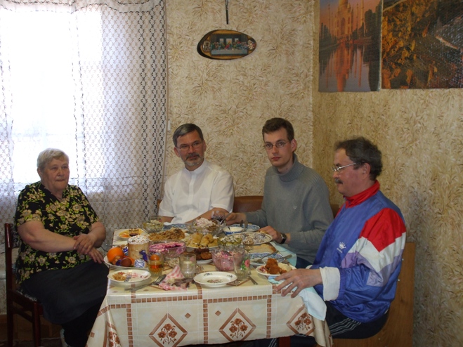 Nun noch ein paar Zeilen zur Fastenzeit hier: Stellenweise war es ganz schön hart, aber ich habe es durchgehalten! Ich bin sehr glücklich darüber, dass ich sie soweit gut durchgehalten habe. Das Fastenbrechen mit Vater Paul... Nun gut - man kann es durchgehen lassen. Und am Ostersonntag die drei Hackfleischbällchen, die in der Cremesuppe waren: Es gelten Fastenerleichterungen für Reisende. Auch dies ließe sich entschuldigen und außerdem war da ja das katholische Osterfest. Ich bin sehr zufrieden und werde es im nächsten Jahr in Münster auch ausprobieren, sofern es die Umstände zulassen. Die Liturgien in der Fastenzeit waren durchweg alle sehr schön und es war eine sehr intensive Zeit für mich, die meinen Glauben bestimmt noch einmal etwas gefestigt hat. Besonders der Kanon des Heiligen Andrej Kritskij und die Liturgie der vorgeweihten Gaben waren jedes Mal wunderschön. Ich habe aber in Saratov auch gemerkt, dass ich katholisch bin und es auch wohl immer bleiben werde. Dort in der Kirche habe ich mich sofort heimisch gefühlt und es im Inneren viel mit meiner Heimatgemeinde in Oldersum verglichen. So schön alles Orthodoxe auch ist und so sehr ich es auch liebe - letztlich bin ich doch Katholik. Vielleicht ein manchmal mittlerweile sehr orthodox denkender Katholik.