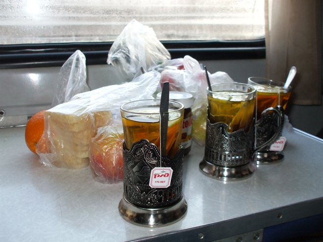 (9:30 morgens:) Nun beginnt heute die letzte Fastenwoche, die zugleich wieder eine Strenge ist. Die letzte Nacht habe schlecht geschlafen auf der harten Pritsche, da ich immer mit den Beckenknochen hart gelegen habe. Zudem konnte ich die Beine nicht ausstrecken, da sie sonst weit über die Hälfte in den Gang hineingeragt hätten. Alles in allem war ich oft wach und habe schlecht geschlafen. Manchmal, wenn ich aus dem Fenster geschaut habe, konnte ich Felder sehen, die abgebrannt wurden. So waren manchmal im Dunkeln kleine Feuerstreifen zu sehen. So war ich ab sieben Uhr wach und bin kurz vor acht aufgestanden. Wir haben dann gemeinsam gefrühstückt und den Tee des Zuges getrunken - die Teebeutel trugen das Logo der russischen Eisenbahngesellschaft.