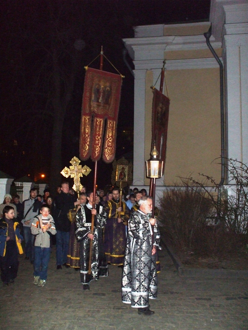 Dort, wo sonst die Tagesikone liegt, stand nun das große Kreuz, das sonst links steht. Nun wurde seine wirkliche Größe erst offenbar. Es ist vielleicht drei Meter groß und sieht sehr erhaben vor der Ikonostase aus. Anschließend wurde das Kreuz verehrt und dann haben viele das Licht mit nach Hause genommen, mit der dann der Hauseingang gesegnet wurde, das heißt, dass ein Rußkreuz unter den Türrahmen gemacht wurde. Das war für mich auch sehr fremd, zumal bei uns am Gründonnerstag in der Kirche das Ewige Licht ausgemacht wird. Es war ein sehr schöner Gottesdienst und auch sehr besinnlich, doch hatte ich immer das Gefühl, das für mich Ostern schon gewesen ist - das war Weihnachten noch ganz anders. Alles erinnerte sehr an den katholischen Karfreitag - bislang gefällt mir das Lesen der Prozession in der katholischen Kirche und die vorösterlichen Gottesdienste besser: Sie ist einfach schmuckloser...