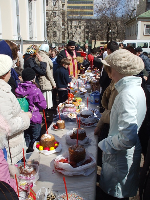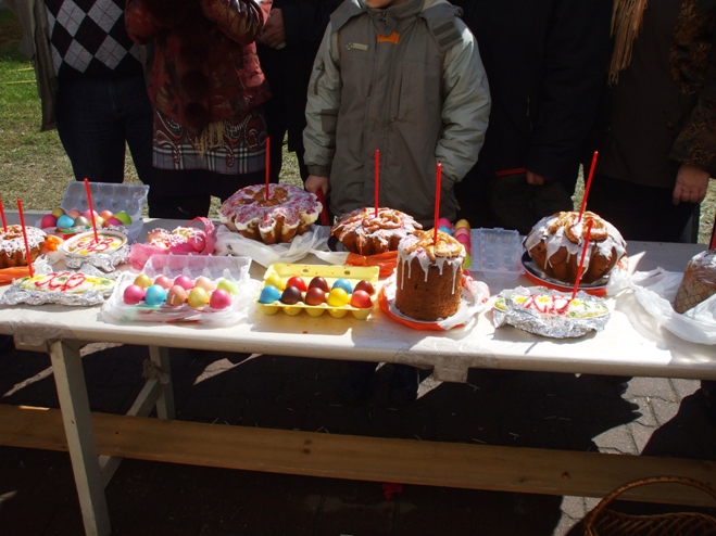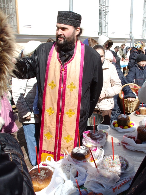 Die Göttliche Liturgie des Hl. Basilius fing mit einigen Gottesdiensten vorher schon um sieben Uhr an, aber ich war zusammen mit Masha erst um etwa viertel vor acht dort. Zunächst waren Stundengebete, dann der Morgengottesdienst, der in die Göttliche Liturgie eingeflochten war. Alles wurde wieder von sehr schönen Gesängen dominiert. Als ich vor der Eucharistie kurz draußen war, standen da schon eine Menge Leute, die ihre Osterkuchen und Eier gesegnet haben wollten. Dazu standen eigens jede Menge Tische aufgestellt und ein Priester ging durch die Reihe. Am frühen Nachmittag war ich noch einmal dort, um bei Sonnenschein das Spektakel zu fotografieren. Jetzt war Vater Georgij am segnen und er hat so gesegnet, dass auch keiner zu wenig von dem heiligen Wasser abbekommt. Den Tag wurde, wie es sonst üblich sein sollte, nicht in Ruhe begangen, sondern viel eher mit den letzten notwendigen Vorbereitungen für die Feier in der Nacht.