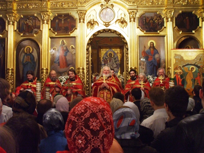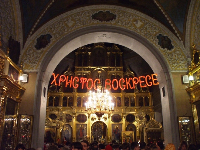 wurden die Türen geöffnet und alles strömte zurück in die Kirche - mit sehr viel Gedrängel und Gequetsche. Masha und ich habe einen recht guten Platz bekommen - etwa in der Mitte der Kirche, so dass zumindest ich gut sehen konnte. Während dem Osterkanonikon traten alle Priester zu zweit oder zu dritt vor die Königstüren und segneten die Gläubigen mit einem Kreuz mit drei Kerzen und jedes Mal wurde drei Male der Osterruf gerufen und lautstark von der Gemeinde beantwortet - so dass ich mich beim ersten Mal erschrocken habe. In der Kirche hat sich einiges verändert: In den Kerzenständern waren jetzt rote Kerzen zu finden, über den Königstüren der Ikonostase waren die Leucht-Insignien "XB" angebracht - für "Christus Voßkreße", was übersetzt "Christus ist auferstanden!" heißt und es hing noch ein beleuchtetes Spruchband unter dem Bogen mit dem gleichen Spruch. Die Priester haben sich alle umgezogen - einige mehrfach: Während dem Osterkanonikon hatten alle bunte Gewänder an und anschließend haben sich alle in rot umgezogen. Die ganze Liturgie war durch große Freude und Freude geprägt. Viele aus der Gemeinde hatten die passende farbige Kleidung angezogen, die Frauen vor allem Kopftücher und Kleider in roter und weißer Farbe. Und auch die Gesänge der Göttlichen Liturgie des Heiligen Johannes Chrysostomus waren auf auf Ostern abgestimmt - immer wieder wurden Osterlieder gesungen. Die große Besonderheit war, dass das Evangelium (Joh. 1,1-17) in Griechisch, Latein und Kirchenslawisch gelesen wurde. Nach der Kommunion haben sich schon alle zum Osterfest gratuliert und kleine Geschenke ausgetauscht - in der Hauptsache bunte Ostereier und Kulitschi - also kleine Osterkuchen. Alles in allem war es die wohl feierlichste Liturgie, die ich hier miterlebt habe. Ich habe mich die ganze Zeit auf das Osterfest gefreut - zu Recht. Kurz vor vier Uhr sind wir dann nach Hause gegangen - es hatte etwas geschneit - und haben das Osterfest gebührend mit einem guten Essen begangen und die Fastenzeit ebenso feierlich beendet: Es gab viele Salate, Eier, Quark und natürlich Fleisch. Gegen fünf Uhr habe ich dann völlig müde im Bett gelegen und geschlafen.