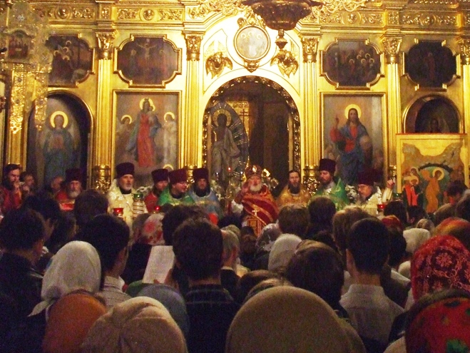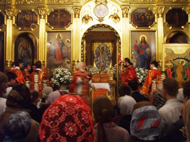 Nachdem ich noch ein bisschen an der Hausarbeit gesessen habe, bin ich in die Stadt gefahren und bin dort durch strömenden Regen zur Post gegangen, um einen Einschreibebrief aufzugeben. Anschließend habe ich bei Masha an der Hausarbeit weiter gemacht. So langsam zeigen sich Fortschritte und vielleicht schaffe ich es tatsächlich zum nächsten Wochenende, die Hausarbeit vollständig fertig zu haben. Zu halb vier bin ich zur Fakultätskirche gegangen, weil ich die Vermutung hatte, dass heute noch eine Chorprobe ist. So wäre es auch gewesen, wäre Vater Alexej nicht krank geworden. So haben wir erst zu sechst alleine etwas geprobt und zu genau fünf Uhr kam Vater Michael in die Kirche als Vertretung für unseren Regenten. Der Chor bestand heute überwiegend aus Studenten gehobener Kurse, so dass heute wenig Unruhe herrschte. Auch war der Gesang heute sehr viel besser. Zum einen waren nur solche dabei, die Spaß an der Sache haben und dann hat Vater Michael den Chor sehr energisch und kraftvoll reagiert. So haben wir die meiste Zeit so laut gesungen, dass wir manchmal erst viel zu spät gehört haben, dass die Priester und Diakone im Altarraum "mit" uns gesungen haben aber nicht so wie wir waren. So hat der Abendgottesdienst richtig viel Spaß gemacht und war noch einmal ein tolles Erlebnis. Nun hoffe ich sehr, dass es morgen auch so schön wird. Dann singen wir die Göttliche Liturgie - es ist der letzte Ostersonntag, denn nächste Woche ist Christi Himmelfahrt und damit endet die Osterzeit. Dann werden die Ostergesänge alle wieder verstummen und alles wird wieder in seine übliche Ordnung übergehen.