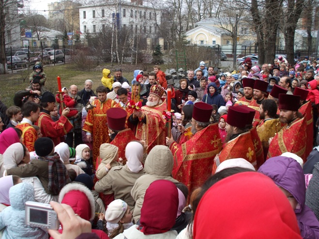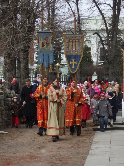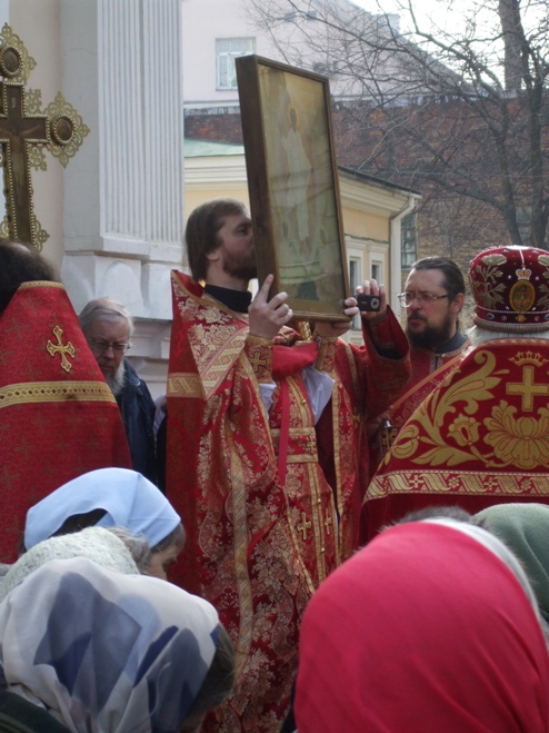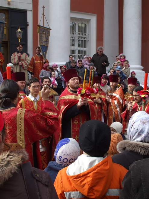 Heute Morgen musste ich schon um kurz nach sechs Uhr aus den Federn - was mir ordentlich schwer gefallen ist, da ich heute mit Masha in die Gemeinde von Vater Alexej Emeljanov wollte. Wir haben uns an der Metro-Station Poljanka getroffen - zeitgleich mit Janka und Djadja Slawa (Onkel Slawa - einer der Hausmeister der theologischen Fakultät und bekannt wie ein bunter Hund). Die kleine Kirche hat heute ihr Patronatsfest und es ist Tradition, dass die meisten Priester der Fakultätskirche dann bei ihm zelebrieren. Die Kirche ist recht alt - 105 Jahre - und war nach der Zeit des Kommunismus beinahe abrissreif. Sie ist im Laufe der Zeit wiedererrichtet worden und hat von innen jetzt sehr schöne Fresken in verschiedenen Stilrichtungen. Von außen sieht die Kirche aber noch stark renovierungsbedürftig aus. Nach der fröhlichen österlichen Liturgie gab es dann noch zwei Glückwünsche: den einen von Vater Vladimir an Vater Alexej Emeljanov, der heute sein 18-jähriges Weihejubiläum hat, den anderen von Vater Alexej an Vater Vladimir, der eine neue Auszeichnung für sein Lebenswerk erhalten hat: Er darf fortan mit geöffneten Zarentüren dienen. Dies ist für ihn eine Umstellung, da er, wie er sagte, eigentlich seine Ruhe dort braucht. Und für ihn ist es vielmehr ein Geschenk an die Gemeinde, die ihm nun zuschauen darf. Ganz im Anschluss werden ja immer das Kreuz und die Hand des Priesters geküsst. Masha und ich sind hintereinander hingegangen. Zu Masha hat Vater Alexej mit einem Lächeln im Gesicht in etwa gesagt: "Ah, die deutschen Gäste sind angekommen!" und zu mir darauf das Gleiche. Da hat uns wohl jemand durchschaut und uns das durch die Blume gesagt - allerdings mit einer großen Wolke Blütenstaub. Ich habe ihm auch gratuliert mit dem Hinweis, dass mein Geschenk für ihn noch nicht fertig ist. Ich schreibe bei ihm ja meine Hausarbeit.