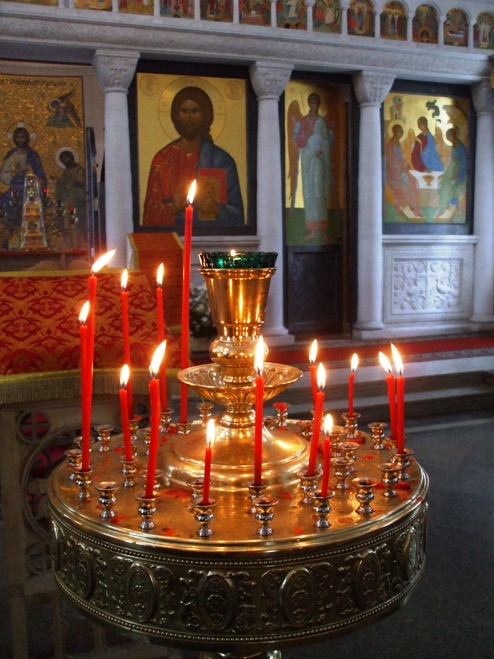 Vater Alexej Emeljanov segnet die Gemeinde mit dem Kreuz und drei Kerzen...