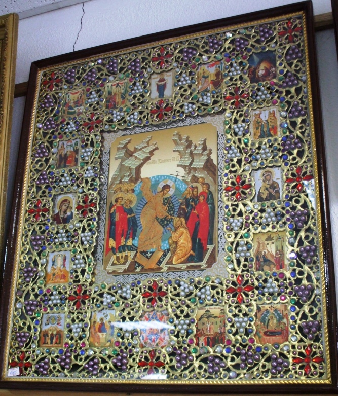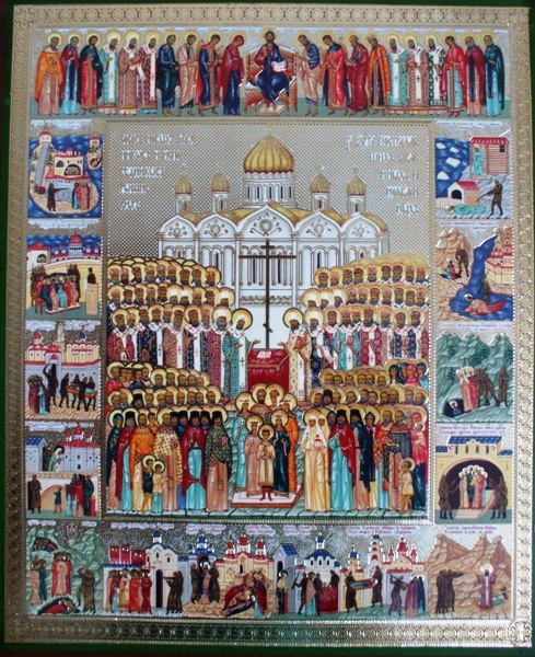 Nun möchte ich kurz auf die Ikone eingehen, die ich zu Ostern geschenkt bekommen habe. Ich will sie ein wenig beschreiben und will dies im Uhrzeigersinn tun. Ganz oben finden sich folgende Heilige Russlands: Johann, Sergej von Radonesch, Boris, Iov, Iona, Pjotr, Andrej Rublow, Pjotr, Erzengel Gabriel, Gottesmutter Maria, Der Herr Jesus Christus (auf dem Thron), Johann der Täufer, Erzengel Michael, Pawel, Fürst Vladimir, Alexij, Philip, Jermogen, Gleb, Serafim von Sarov, Amvrosij von Optina. Rechts darunter ist das Gefängnis im Winterdorf Chje in Sibirien und Erschießung des geistlichen Märtyrers Pjotr dargestellt. Dieser Heilige, der evtl. der Nachfolger vom Patriarchen Tichon werden sollte, ist auf der Ikone auch vor der Christus-Erlöser-Kathedrale und rechts neben dem Altar zu sehen, also in der ersten Reihe der höhergestellten Heiligen. Darunter wird die Ermordung der geistlichen Märtyrer Andronik und Jermogen gezeigt und eine Szene weiter die der gerechten Märtyrerin Elisabeth und die anderen, die mit ihr waren. Wiederum darunter ist die Abbildung der Zarenfamilie des Hl. Zaren Nicolai, seiner Frau Hl. Alexandra, des Zarjewitsch Hl. Alexej und ihren Hll. Töchtern Olga, Tatjana, Maria, Maria und Anastasia. Sie sind auch noch einmal unten in der Mitte der Hauptikone zu finden. Wenn die Ikone weiter von oben links betrachtet wird, dann zeigt sich dort das Leiden der Heiligen Neuen Märtyrer auf der Insel Solovki. Auf dieser Insel im Weißen Meer etwa 530km nördlich von St. Petersburg entstand das erste große sowjetische Häftlingslager in einem Kloster. Dort befand sich auch eine große Treppe, wo viele Inhaftierte gefesselt hinuntergestoßen wurden und so den Tod fanden. Darunter wird gezeigt, wie die Gottlosen (Richter) den den Heiligen Veniamin und diejenigen, die mit ihm waren, zum Tode verurteilen. Viele Gerichtsurteile wurden in dieser Zeit ohne ein ordentliches Verfahren gefällt. Wiederum darunter wird ein Teil der Geschichte des Klosters von Sergijew Possad gezeigt, als die Gottlosen - so werden die Sowjets hier bezeichnet - das Kloster plündern, verwüsten und entweihen und die Heiligen Gebeine wohl des Hl. Sergej von Radenosch entführen. Die letzte Abbildung in dieser Spalte zeigt den unter Arrest stehenden Hl. Patriarchen Tichon, der erst in der Lubjanka inhaftiert war und dann im Donskoj-Kloster unter Hausarrest stand. Zuletzt die untere Reihe von links nach rechts: Dort findet sich zuerst die Ermordung der Hl. Gerechten von Butovo, das im Süden Moskaus liegt. Dieser Ort ist heute eine Gedenkstätte der Russisch-orthodoxen Kirche und wird auch das russische Golgotha genannt. Hier sind am Tag bis zu 500 Menschen durch Genickschuss ermordet und dann verscharrt worden - von August 1937 bis November 1938 waren es fast 21.000 Menschen. Vor und nach dieser Zeit gab es unzählige weitere Ermordungen. Dieser Platz war bis 1991 weiträumiges Sperrgebiet. Neben den Geschehnissen von Butovo wird auf der Ikone die Erschmordung der Prozessionsteilnehmer von Astrachan gezeigt. Es folgt ein Doppelbild in der Mitte: Der Märtyrer Vladimir von Kiew wird zu seiner Hinrichtung geführt und später aufgefunden. Eine Ikone weiter wird ein Priester vom Altar während der Göttlichen Liturgie entführt. Es folgt die Schließung des Klosters von Sarov und die Entführung der Gebeine des Hl. Serafim Sarovskij und letztlich die Ermordung des Märtyrers Kyrill von Kasan und denjenigen, die bei ihm waren.
