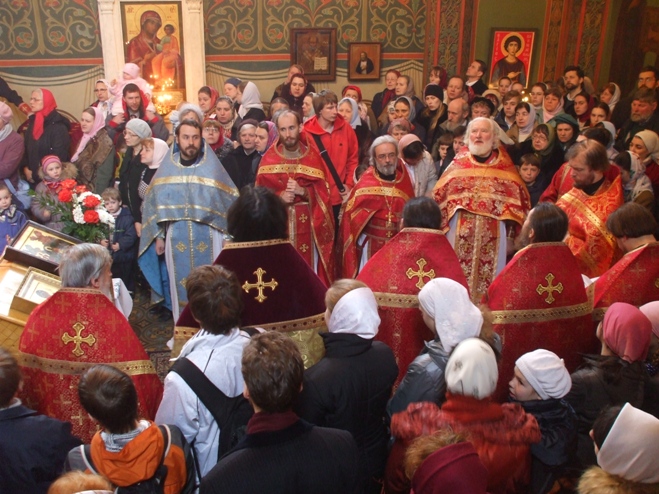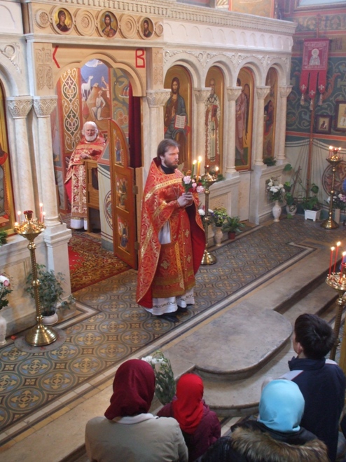 Nun will ich mir noch einen kleinen Blick in die Gemeinde leisten, in der ich mich mittlerweile sehr zu Hause fühle und zu der ich sehr gerne hingehe. Wenn ich im Chor stehe, dann blicke ich vor allem samstags abends und sonntags in ein sehr gut gefülltes Gotteshaus. Zumeist stehen auf der linken Seite die Frauen (die an ihren Kopftüchern leicht zu erkennen sind) und auf der rechten Seite stehen mehrheitlich Männer. Hier kann man aber sicherlich nicht von einer strikten Trennung sprechen - es ist aber doch auffällig. In der Göttlichen Liturgie steht (es gibt ja keine Kirchenbänke) vorne meistens ein ganzer Pulk Kinder - die meisten aber sehr artig und gesittet. A propos Kinder und Familien: Sehr viele Frauen und einige Männer haben Kleinkinder auf dem Arm, die allesamt zur Kommunion gehen oder geführt werden. Dabei ist es auffällig, dass die älteren Kinder auf die Jüngeren aufpassen und sie gegebenenfalls in die Schranken weisen. Dabei kommt es aber nur in absoluten Ausnahmefällen zum Streit. Zudem erwarten viele Familien in Bälde Familiennachwuchs, allein heute Abend habe ich vier Frauen gesehen. Die kleinen Kinder (bis etwa sieben Jahre), die zur Kommunion gehen, müssen noch nicht beichten, da sie als Engelchen gelten und noch nicht verantwortlich für ihre Sünden sind. Dabei hat jeder seinen oder ihren einen Beichtvater, ähnlich wie es in der katholischen Kirche vorkommt. Daraus resultiert letztendlich, dass der Priester der Anzugspunkt oder Gemeinde bildend ist: Die Gläubigen sammeln sich um ihren Beichtvater. In der Fakultätskirche ist es ein sehr guter, weiser und schon fast berühmter Beichtvater, bei dem die Gläubigen am Samstag Abend oder am Sonntag Morgen oft lange in der Schlange stehen müssen, wenn sie bei ihm beichten wollen. Gerade in der letzten Zeit habe ich den Eindruck, dass es dem Priester zu viel wird und er die Menge nicht mehr bewältigen kann. Das führt dann dazu, dass er seine nicht üblichen Beichtkinder an andere Priester verweisen muss. Man kann auch gut beobachten, dass wenn eben der Priester nicht in der Gemeinde ist, dass dann weitaus weniger kommunizieren gehen wollen. Vor der Eucharistie muss ja gebeichtet werden und viele wollen dann nicht auf einen anderen Priester ausweichen. Dadurch entsteht eine feste Bindung und ein inniges Verhältnis zu dem Priester, wodurch möglicherweise hier und dort Einflüsse entstehen können, in jedem Fall die Gemeinde aber geprägt wird. Und letztlich wollen viele dann auch von ihrem Beichtvater die Eucharistie erhalten.