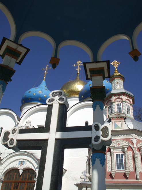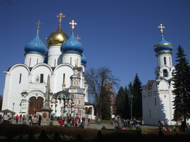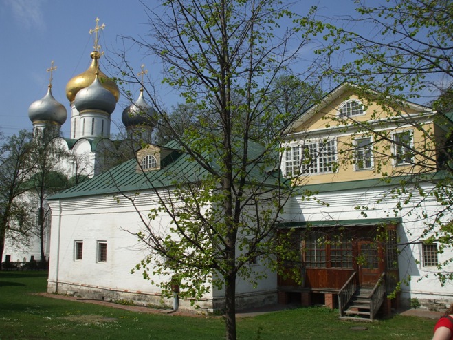 Direkt nach dem Aufstehen um kurz vor sieben sind wir Jungs alle gemeinsam durch den Wald zum Kloster gelaufen. Und wieder konnte man leicht herausfinden, wer aus der Stadt kommt und kaum etwas anderes gesehen hat. Ich habe am Baum einen Specht klopfen hören, habe ihn leider aber nicht gesehen. Als ich die Kommilitonen darauf ansprach, widersprachen sie mir sofort und sagten, dass das Geräusch von keinem Vogel komme, sondern das Aneinanderreiben der Bäume sei. Irgendwann in der Diskussion traf noch ein weiterer Student ein, der sich auskannte und sagte dann, dass das wirklich ein Specht sei. Soviel zu den Kenntnissen einiger Städtler in der Natur. Zu ihrem Schutz muss man aber vielleicht auch sagen, dass ich mich nie so in einer Stadt einfinden kann, wie sie es können. Die Göttliche Liturgie war eigentlich völlig normal - nur ohne die Prozession. In dieser Klosterkirche ging es recht streng zu: Ein Helfer hat mir untersagt, dort zu fotografieren, obwohl am Abend zuvor dort sehr viele fotografiert haben. Später hat er darauf aufgepasst, dass die Leute auch ja keinen anderen Weg von der Kommunion zum Tisch mit dem Zucker-Wein-Getränk und dem Brot nehmen. Und eine alte Frau wollte mich in eine andere Ecke der Kirche verweisen - ich stand unter vielen Frauen, aber mit direktem Blick auf den Altar - und habe ihr dann freundlich gesagt, dass das wichtig für mich wäre wegen meinem Studium. So ganz unrecht hatte ich ja auch nicht, sind doch während der Ostertage die Zarentüren durchgängig geöffnet und auch während der Göttlichen Liturgie, wenn beispielsweise die Priester kommunizieren. Und zudem stehen wir in der Fakultätskirche auch recht durcheinander. Nach der Kirche haben wir gemeinsam in der Gäste-Stalowaja gegessen und haben dann eine Exkursion durch das Kloster gemacht, die aber recht kurz war. Der Mönch hat sehr leise gesprochen, so dass ich kaum etwas verstanden habe. Das Kloster "Maria Einführung in den Tempel" ist recht schön - aber auch genauso ungewöhnlich: Alles sieht so europäisch-italienisch aus. Ich habe von Baustilen nun ja nur sehr wenig Ahnung, aber auf mich macht es halt einen solchen Eindruck, denn die Kirchen machen einen solchen Eindruck und die Häuser nicht minder. In der Sowjetzeit wurde das Kloster zu einem Krankenhaus umfunktioniert, einige Kirchen verloren ihre Türme und in den 70er Jahren wurde es wieder zurückgegeben und wieder hergerichtet. Heute leben in dem Kloster sehr viele Mönche und es ist für seine Starzen, das sind weise, alte Mönche, sehr bekannt. Anschließend nach der Verehrung der zahlreichen Heiligen dort hatten wir noch etwas Zeit, um in den Klosterläden zu stöbern - der große hatte jedoch gerade Mittagspause. Anschließend sind wir mit den Bussen ins Hotel gefahren, haben dort zu Mittag gegessen und sind dann wieder nach Moskau aufgebrochen.