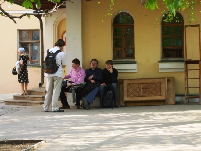 Anschließend waren wir noch bei Sofrino, einem orthodoxen Geschäft und anschließend habe ich bei meinem Internetplatz die Homepage erneuert und habe mich dann bei Masha zu Hause an meine Hausarbeit gesetzt. In der letzten halben Stunde vor dem Abendessen habe ich es geschafft, zwölf Mails zu beantworten, die auf meinen Osterbrief reagiert haben. Das ist schon fast rekordverdächtig für mich! Nach dem Essen sind wir dann zur Moskauer Philharmonie aufgebrochen, wo ich durch Kusma an Karten für ein kleines Konzert gekommen bin. Es wurden durch ein Quartett Lieder von Richard Strauß und von Kusma selbst gespielt. Im letzten Teil trat dann noch eine Sängerin auf, die mir nicht so gefallen hat - nicht, weil sie nicht singen konnte, sondern eher weil mir weiblicher Operngesang nicht so zusagt. Alles waren Studenten des Moskauer Konservatoriums. Wer einen Abschluss dieser Universität hat, vor dem hat man in Russland Achtung und zollt ihm Anerkennung. Nach dem Konzert hatten wir noch etwas Zeit und sind Eis essen gegangen. Heute war ich dann wieder etwas früher im Wohnheim, da ich morgen früh aus den Federn muss. Morgen fahre ich ja für zwei Tage nach Optina in ein Kloster - es ist eine Art Ausflug, der von der theologischen Fakultät angeboten wird. Ich denke, dass es eine schöne Fahrt werden wird.