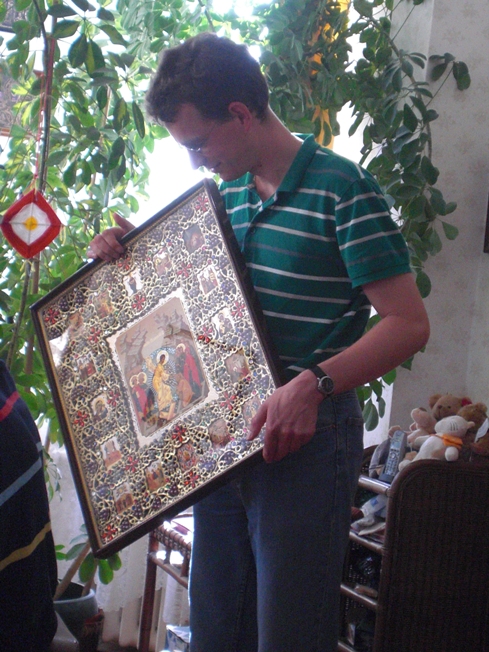 Nach der Göttlichen Liturgie und der Prozession hatte ich dank Onkel Slawa die Gelegenheit, auf dem Glockenturm der Nicolai-Kirche zu läuten. Dort oben sind auch einige schöne Fotos entstanden. Heute in der Kirche ging es mit diesen kleinen Sticheleien seitens der Priester weiter: Als Masha und ich nach der Liturgie gemeinsam zum Kreuz küssen gegangen sind, hat Vater Vladimir uns ein kleines Herz in die Hand gedrückt, in dem drei kleine Schokoladeneier sind. Anschließend bin ich zu Masha gegangen, wir haben dort gegessen und ich habe als Ostergeschenk eine Ikone der neuen Märtyrer Russlands bekommen - also die Menschen, die während der Sowjetzeit aufgrund ihres Bekenntnisses zum Herrn Jesus Christus ums Leben gekommen sind. Die Fakultät hat einen großen Teil dazu beigetragen, dass diese Menschen, die für ihren Glauben gestorben sind, heilig gesprochen werden und sie hat auch die Ikone dazu angefertigt. Sie wurde im Jahr 2000 bei der Heiligsprechung in der Christus-Erlöser-Kathedrale geweiht und kanonisiert.