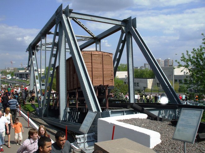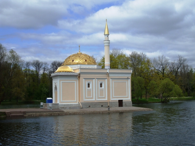 Anschließend sind wir noch durch den großen Park "gelustwandelt" und haben ihn uns in Ruhe angeschaut. In dessen Mitte ist ein recht großer See mit kleinen Schlösschen dabei. Zudem findet sich dort eine türkische Banja, die von außen wie eine Moschee aussieht. Die Parkanlage ist sehr schön aufgemacht und die Wege, die über viele kleine Brücken führen, einfach toll zum Bummeln. Wer aus der Großstadt kommt, kann sich dort gut erholen, sofern natürlich nicht zu viele Großstädter dort sind. Nach einem Eis sind wir in ein Café gegangen, das einem deutschen Schnellimbiss gleicht. Da die Preise dort waren zwar gering, die Portionen aber auch, so dass Matthias und ich gleich zwei Gerichte gegessen haben. Anschließend sind wir zum Bahnhof gegangen und zu einem alten Eisenbahnmuseum gefahren, dass zwischen St. Petersburg und Detskoje Selo liegt. Ich hatte auf der Hinfahrt eine Bahnstation gesehen, die "Dampflokmuseum" heißt und von der Strecke dann die Exponate gesehen. Allerdings war ich von denen nicht sehr begeistert - sie waren zwar noch gut als Dampfloks und andere Fahrtzeuge zu erkennen, aber sichtlich vergammelt und der Witterung ausgesetzt. Alles in allem ein sehr trauriger Anblick, da hier sicherlich einige wertvolle Loks langsam von der Natur zersetzt werden. In das Museum sind wir gar nicht hereingekommen, da dort ein großes verschlossenes Tor war und die Dame dahinter hat uns erklärt, dass das Museum vor vier Jahren in die Stadt umgezogen sei. Der Wachhund, der erst laut bellte, stellte sich nachher als ein wahrer Kuschelhund heraus, der nachher traurig dreinblickte, als wir wieder gegangen sind. Interessant fand ich dort die Gleisanlagen, die ins Museum gingen: Zunächst scheinen sie regelmäßig befahren zu werden, da die Schienen blank gefahren sind und andererseits gibt es dort eine interessante Entgleisungsanlage, die zur Sicherung der Hauptstrecke dient. Noch interessanter war die undefinierbare Spurweite der Gleise.
